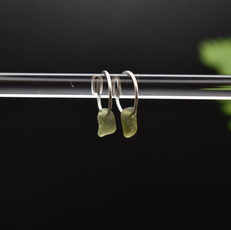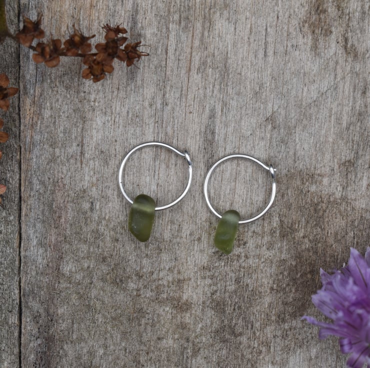 These dainty little hoop earrings have been made using recycled sterling silver, and sea glass collected locally in the Scottish Highlands. The tiny handmade sterling silver 925 hoops have an inside diameter of 1cm, and feature a tiny piece of green sea glass. The small size of these earrings makes them perfect for everyday wear!