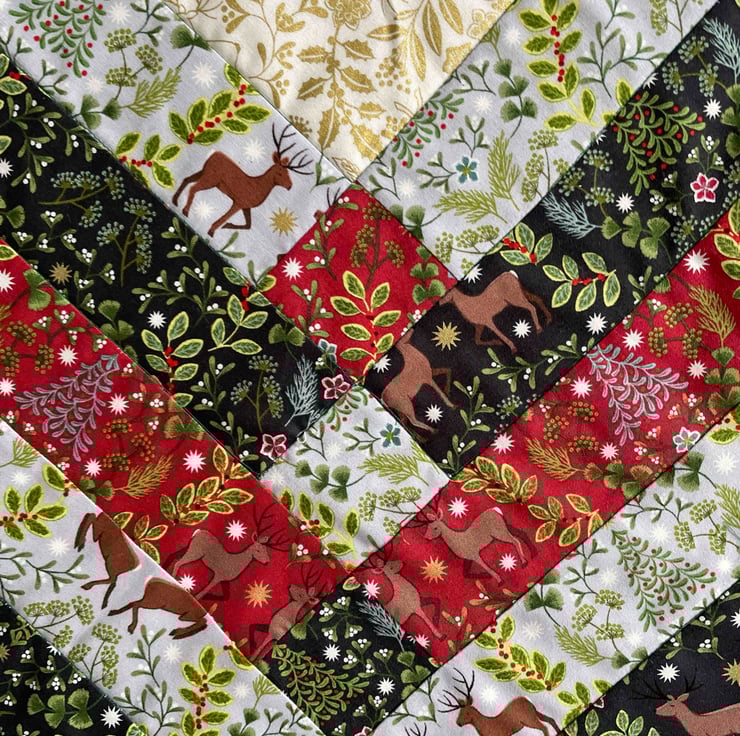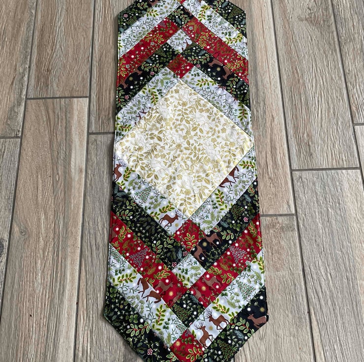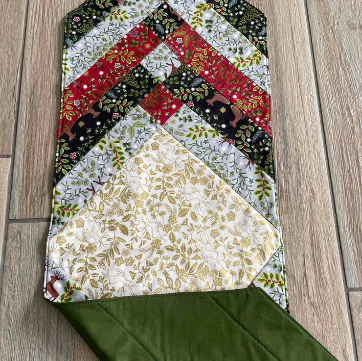 A lovely handmade patchwork quilted table runner for Christmas . Made with 100% cotton fabric and a high quality cotton/bamboo mix wadding. Fabric features reindeers and winter foliage in coordinating cream, green, grey and red fabric. Reverse fabric is green. Measurements approximately 41 x 12.5 ins.