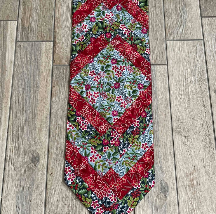 A lovely handmade patchwork quilted table runner for Christmas . Made with 100% cotton fabric and a high quality cotton/bamboo mix wadding. Fabric features flowers and winter foliage in coordinating maroon, green, grey and blue fabric. Reverse fabric is maroon . Measurements approximately 41 x 12.5 ins.