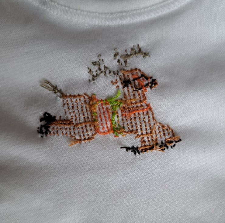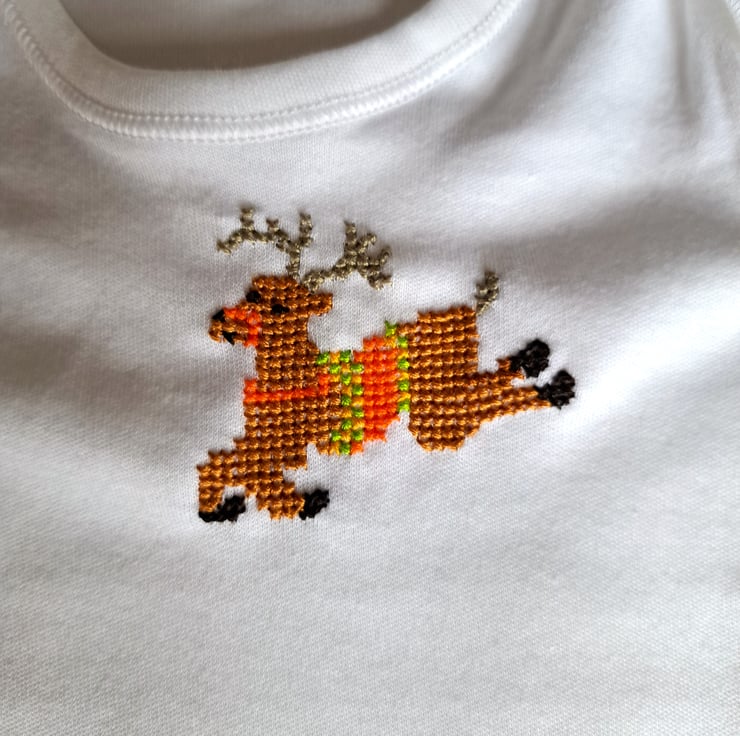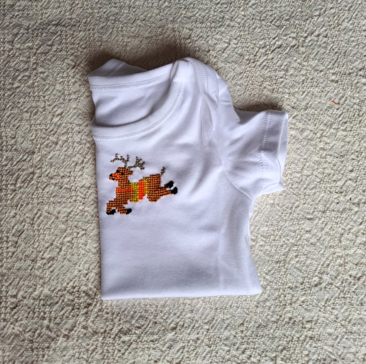 I have made a plain white baby vest/onesie Christmassy by hand embroidering a leaping reindeer on the front. He wears an orange bridle and a green, yellow and orange saddle. The vest has an envelope neck, short sleeves and two press studs between the leg openings. As I never use a permanent backing when hand embroidering kids' clothing, this vest has nothing inside to irritate your child's skin. It is 100% cotton and can be machine washed.