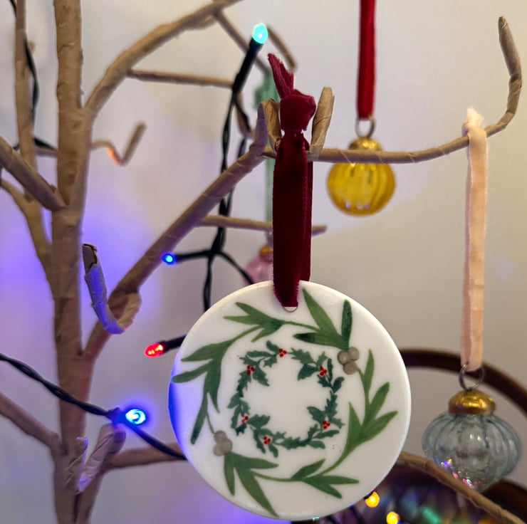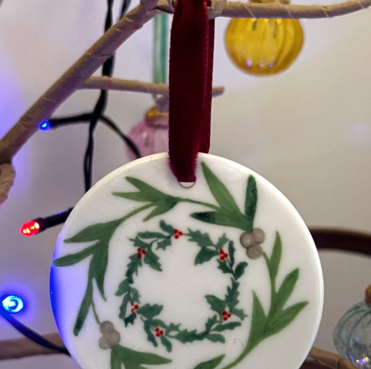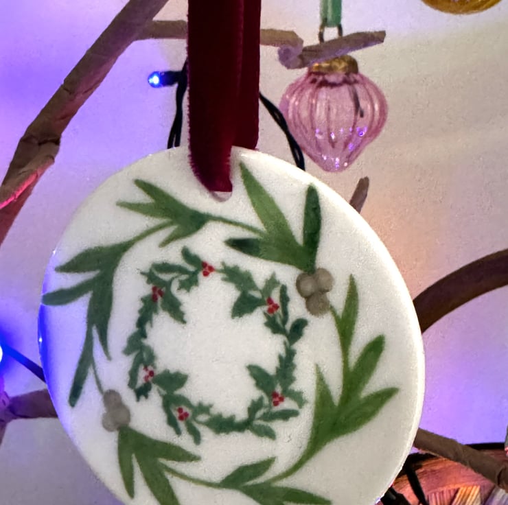 A ceramic bauble which is decorated with a wreath of holly and then surrounded by another wreath of mistletoe. To create this the wreaths were handpainted in watercolours by me and I have used sublimation to print the decoration onto the bauble. A dark red velvet ribbon has been attached to allow you to hang it on the tree.