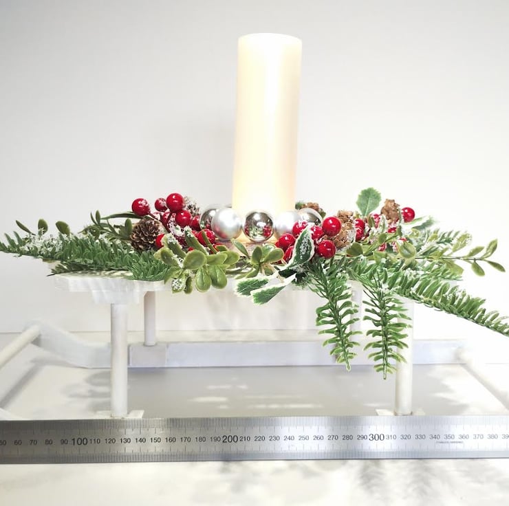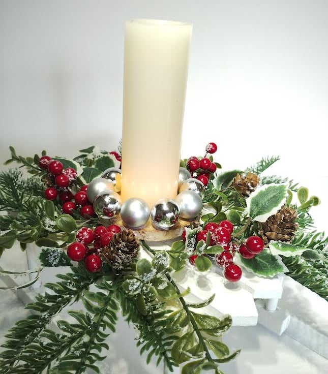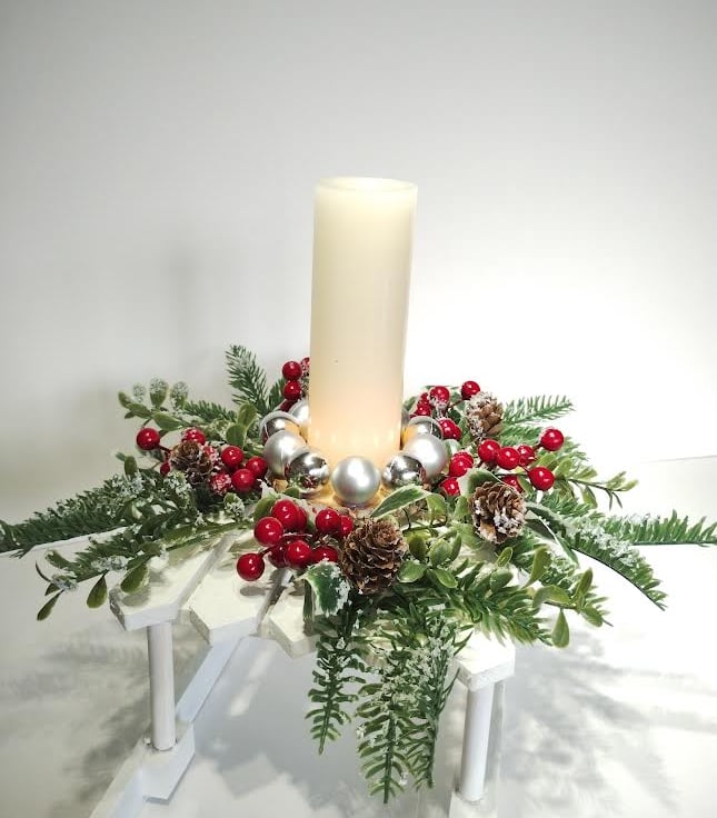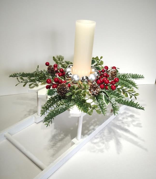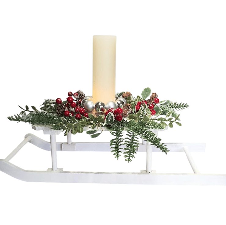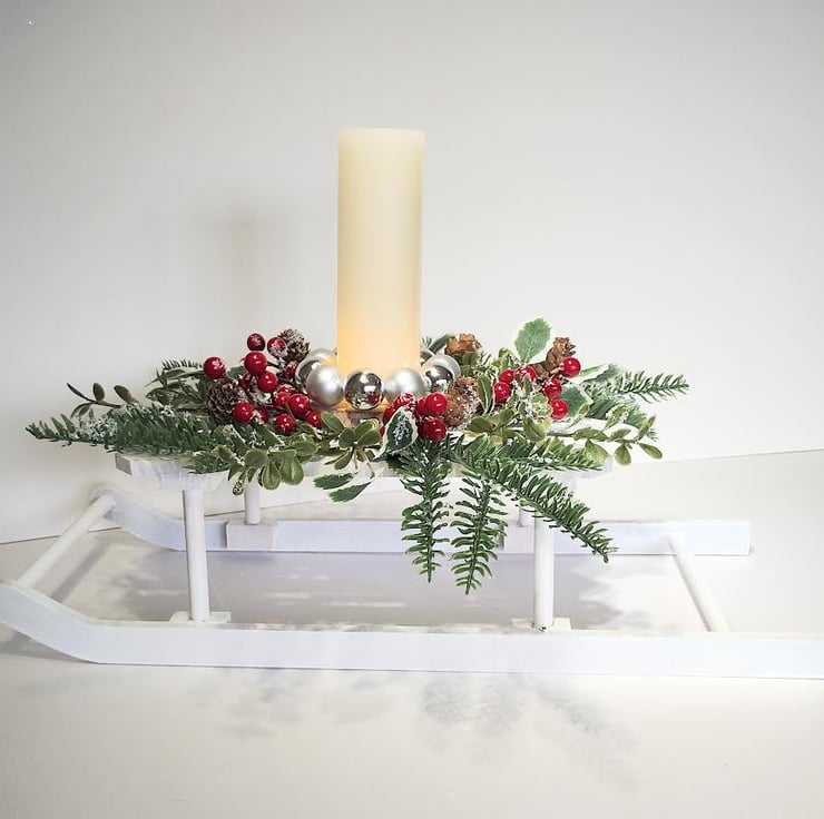 This beautiful white wooden sleigh with a flickering candle and a mixture of artificial foliage in traditional Christmas reds, greens, and silver will be a gorgeous addition to your Christmas collection décor . In it's centre there is a LED wax candle that is kept in place with a circle of silver baubles, which makes it easy to switch the candle on and off. Place it on your dining table as a showpiece before you set it up or the Christmas feast to be admired by family and friends. It is a truly unique keepsake that can be put on display year after year. A beautiful Christmas Gift. Ready to posted now.