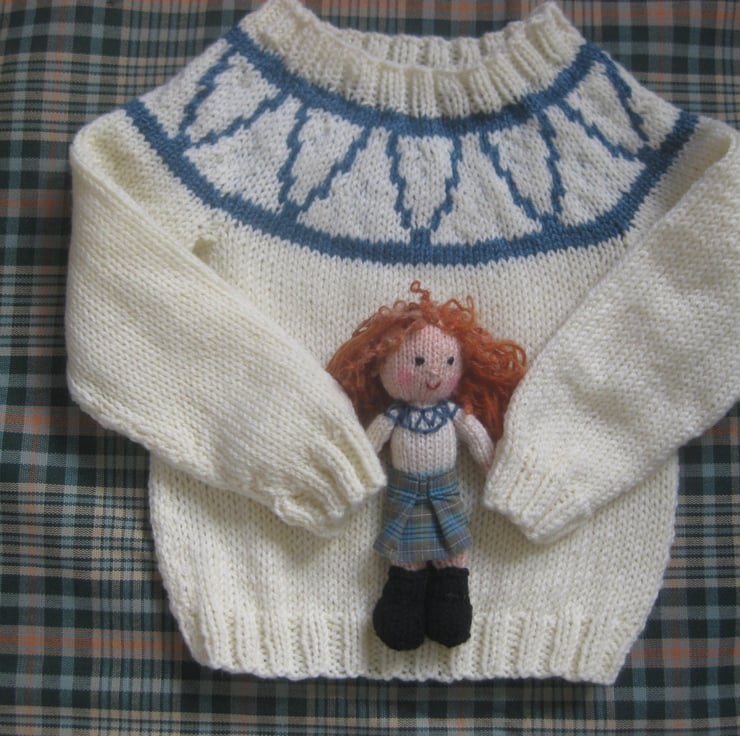Approx 7" high and dressed in a little tartan skirt and of course the famous jumper.
