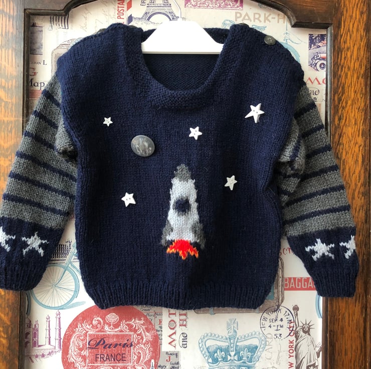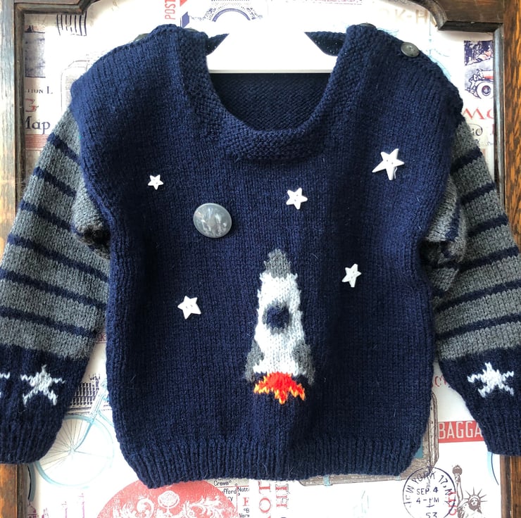 Knitted in acrylic machine washable yarn featuring a rocket and star and Moon buttons .