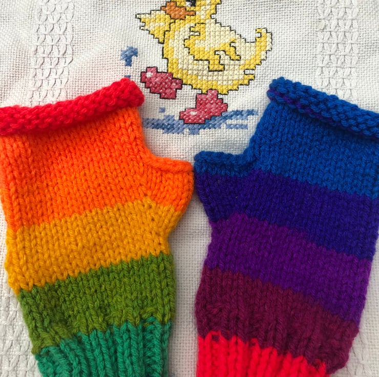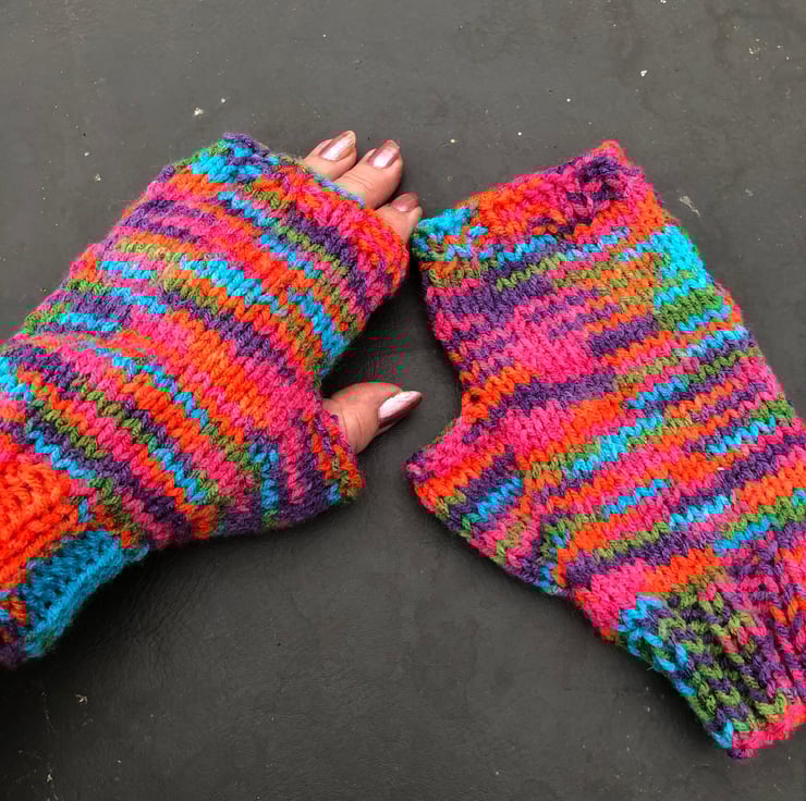 Hand knitted fingerless mittens with thumbs Rainbow ,multi ,Texting gloves .