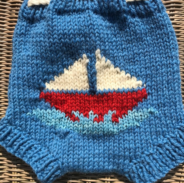 Hand knitted in chunky wool this lovely soaker with a traditional sailboat design .