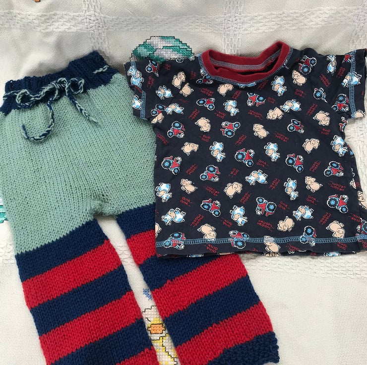 Hand knitted pure wool longies ,Little John butt flap style ,tractor, t shirt