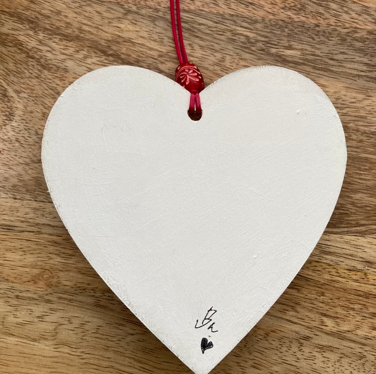 The heart is made of plywood and is threaded with red cord and fancy red bead.