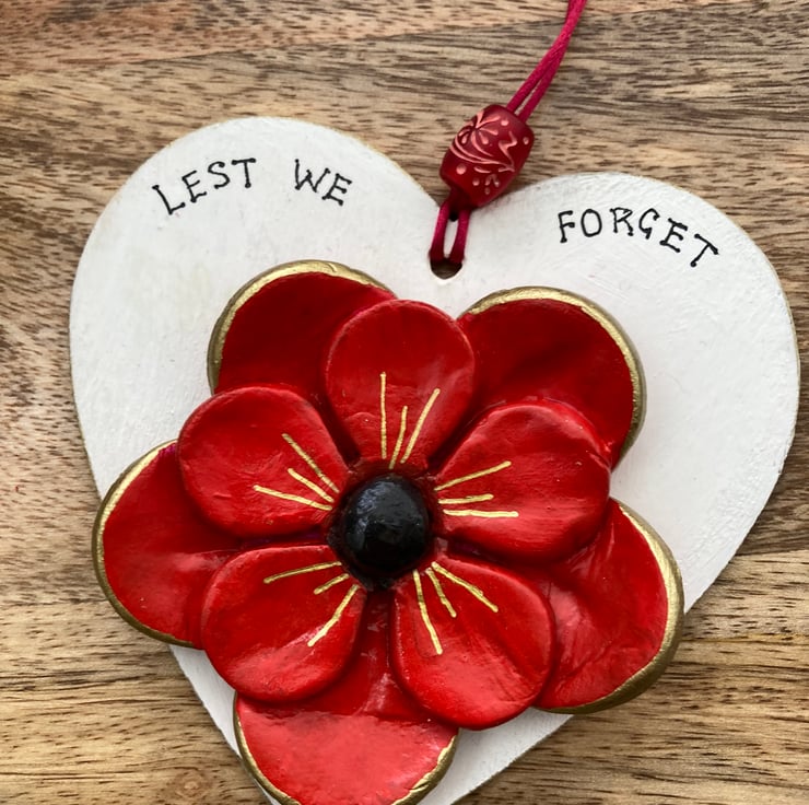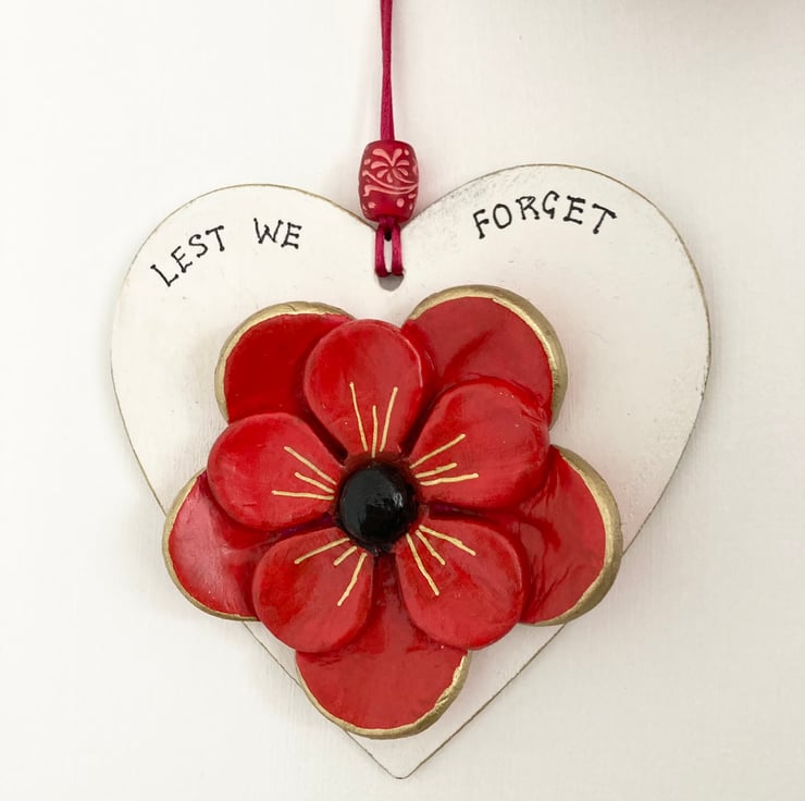 A red air dry clay Poppy mounted on a white wooden heart with the words 'Lest We Forget' written at the top