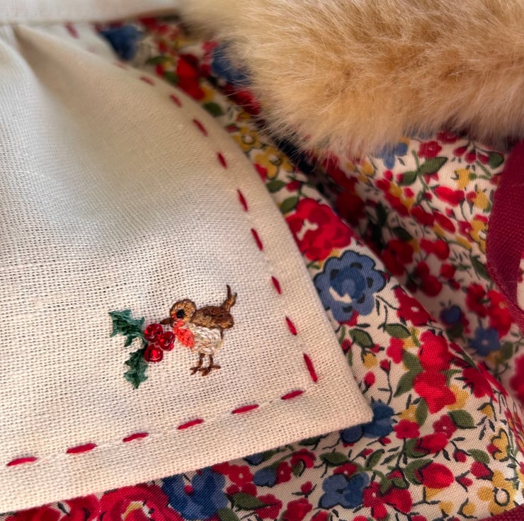 She is wearing a removeable dress made from beautiful Liberty of London fabric in Emma and Georgina red with a little Peter Pan collar.