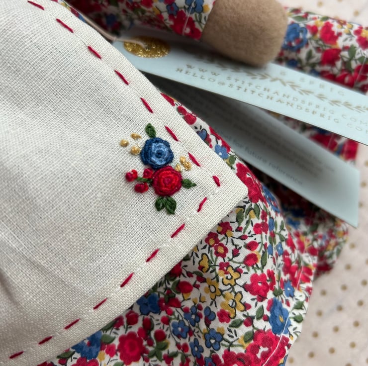 Her apron is made from cotton/linen fabric and embroidered with tiny running stitches and a little embroidery of your choice.