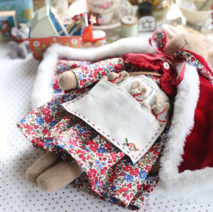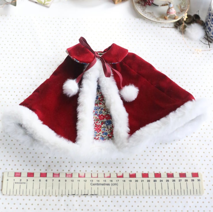 She also has a festive red velvet and fur cape lined with Liberty fabric and Pom Pom ties.