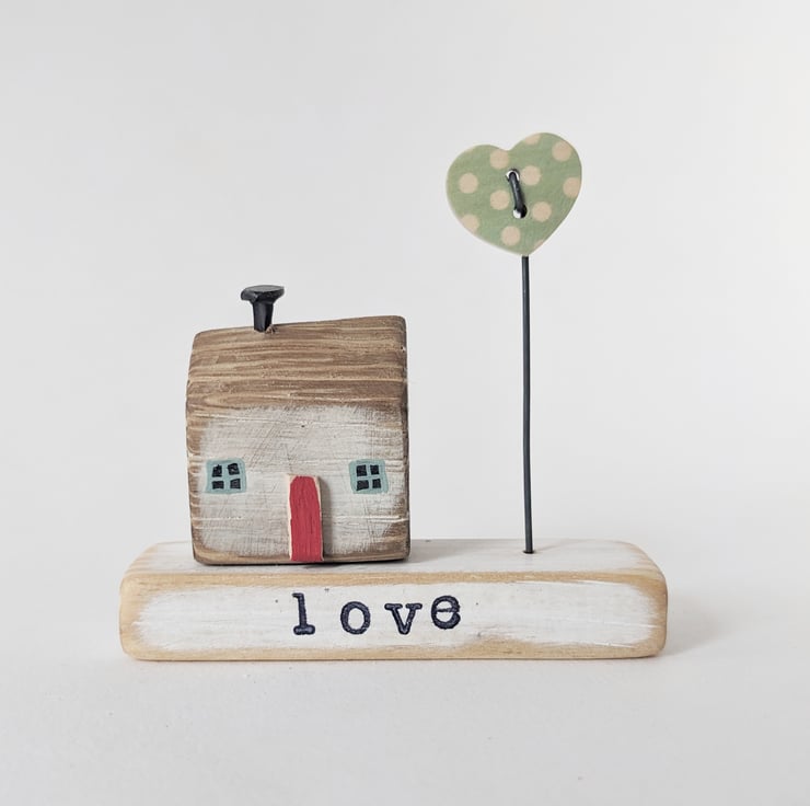 A hand stamped wooden base with a teeny painted house and a happy heart on a wire to stand beside it.