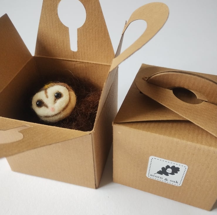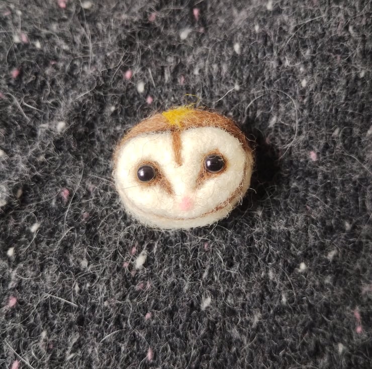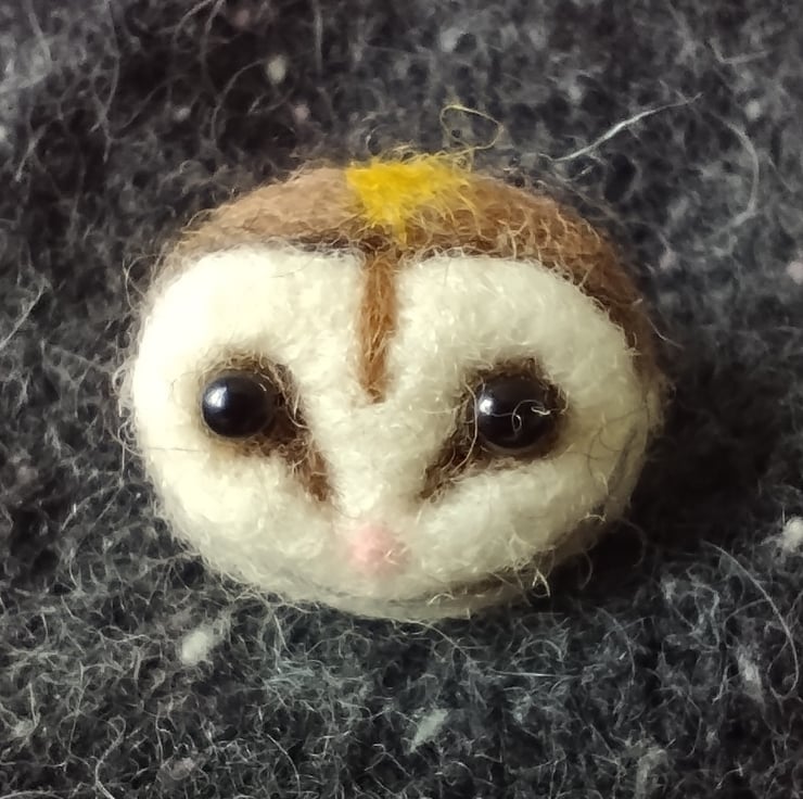 This is a needle felted barn owl brooch, it stands 3cm tall and 3.5cm wide and is made of white and grey Shetland wool, brown Manx Loaghtan wool and some tiny amounts of pink and yellow Merino wool (no polystyrene inner). Wear it on your work coat to remind you of the wilds outside, add it to a scarf for a nature inspired touch or buy it for a friend who loves Barn Owls. Handmade by me, Sara, in the South West of England. Delivered in a kraft paper box lined with natural wool. Sustainable jewellery and packaging.