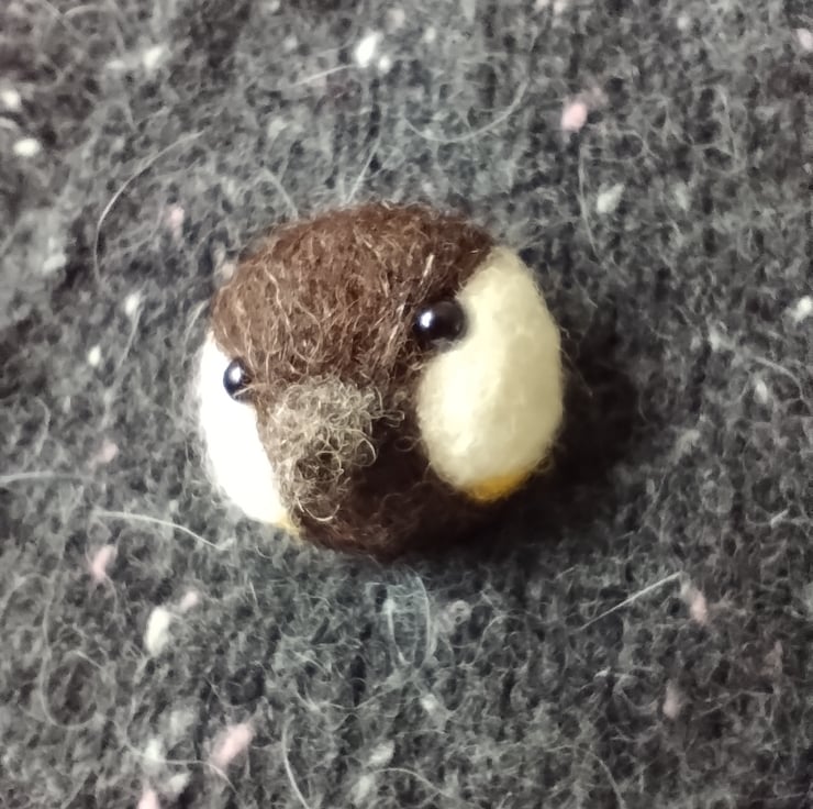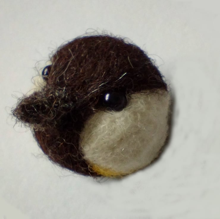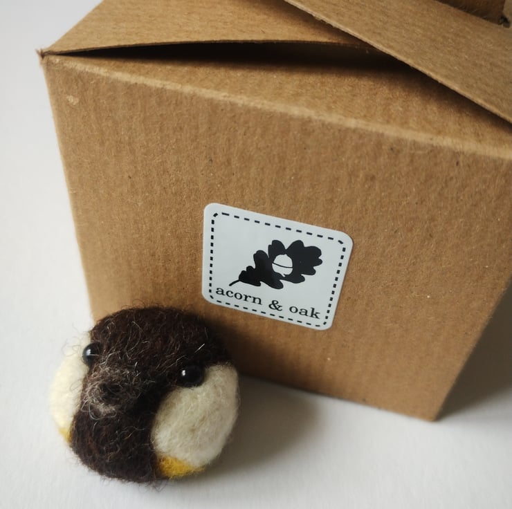 This is a needle felted Great Tit brooch, it is 3cm tall and 3.5cm wide and is made of white and black Shetland wool, and some a tiny amounts of yellow Merino wool (no polystyrene inner). Wear it on your work coat to remind you of the wilds outside, add it to a scarf for a nature inspired touch or buy it for a friend who loves birds. Handmade by me, Sara, in the South West of England. Delivered in a kraft paper box lined with natural wool. Sustainable jewellery and packaging.