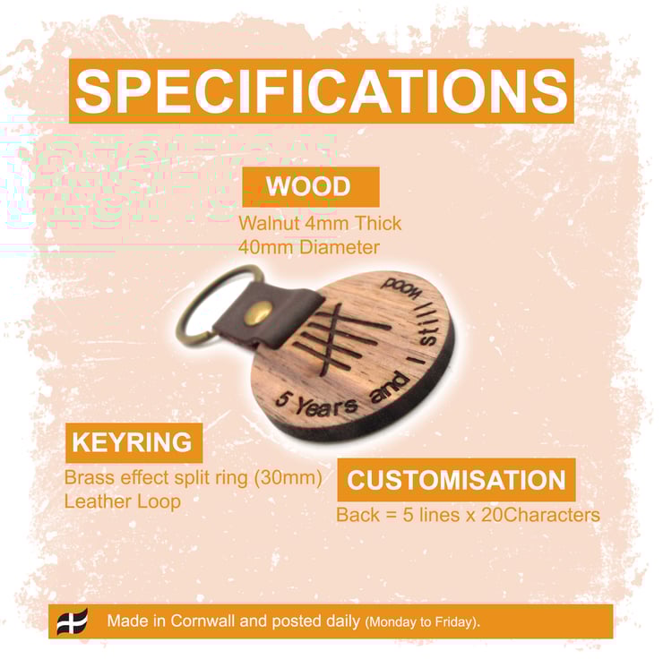 Celebrate your 5th wedding anniversary in style with our personalised wooden keyring! Made from durable walnut wood, this keyring not only adds a touch of elegance to your keys, but also serves as a sweet reminder of your milestone together. Measuring 4mm thick and 40mm in diameter, it's the perfect size to carry with you wherever you go.