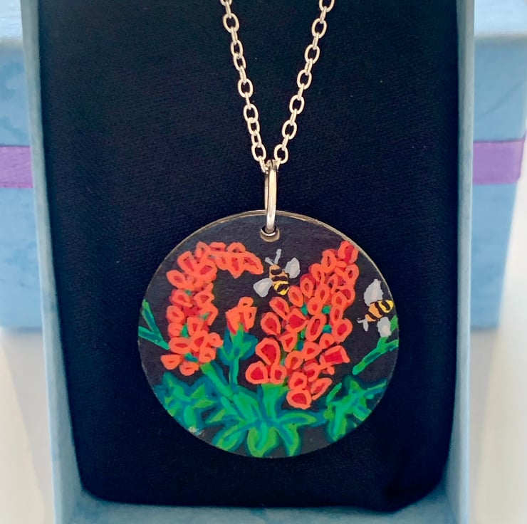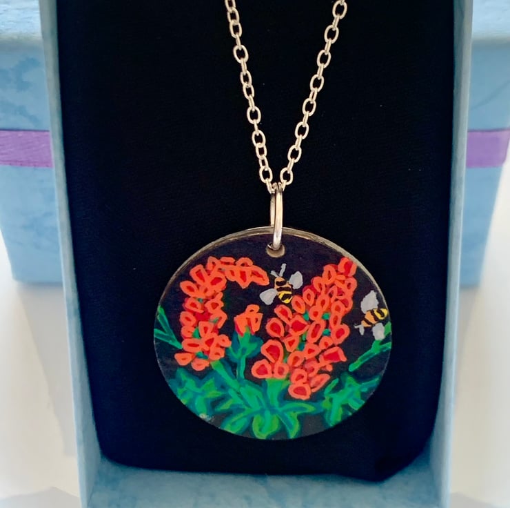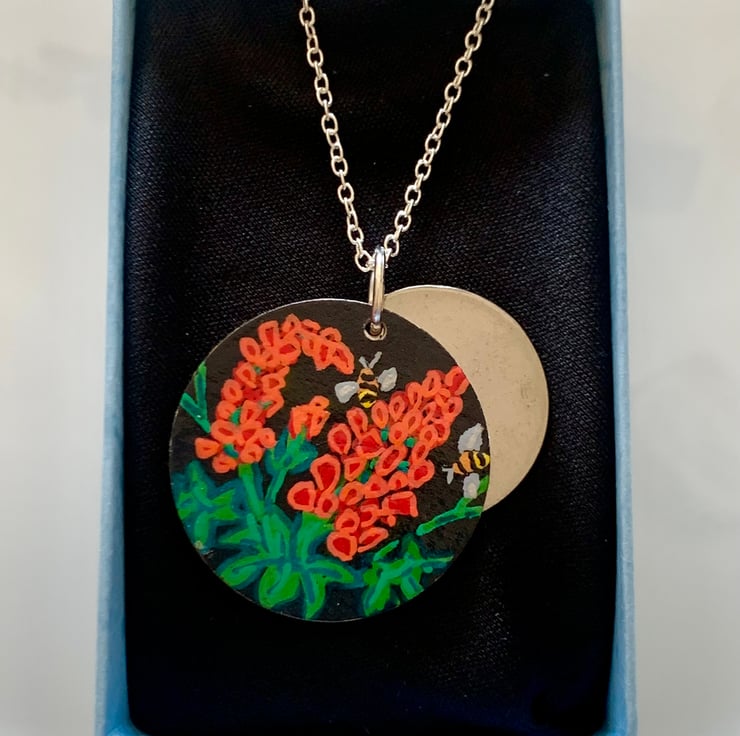 This round wooden Pendant has been Hand painted with a floral design and bees. A black background makes the red of the flower and green of the leaves pop. Added bees add contrast in colour. The pendant is sealed to protect the finished design.I have added a blank engraving disc so it can be personalised with a special message, date or something symbolic which will make it a lovely keepsake for someone. It will come hung on an 18" Silver plated chain.