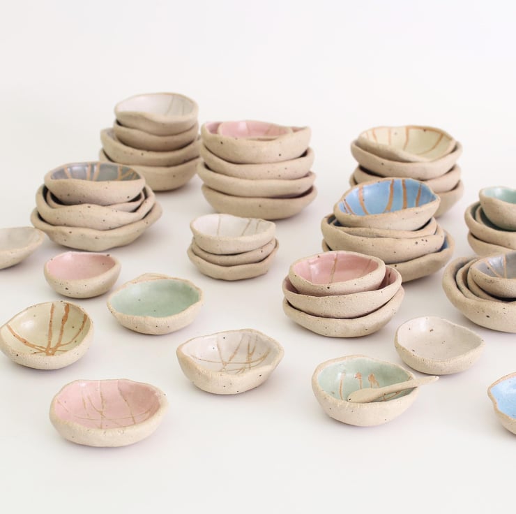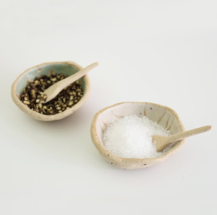 Tiny bowls to serve your salt and pepper from. Small organic forms with a mini wonky spoon. Wonderful wonky bowls in a choice of six unique glaze colours in either a patterned or plain finish. Carefully handcrafted in our Dartmoor studio, each bowl is individual in its shape and design, making them the perfect little gift and ideal for a variety of condiments.