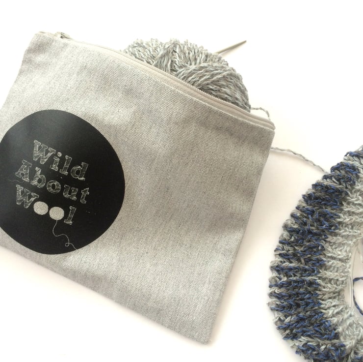 Small zipped Project Bag for all your small wool projects or notions. The bag is a natural ecru with black "Wild About Wool" logo off centre.
