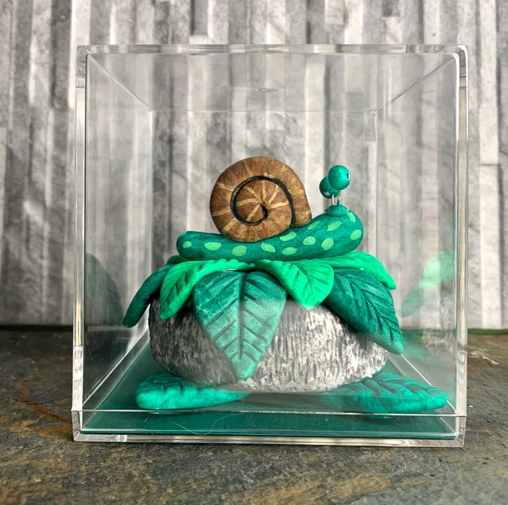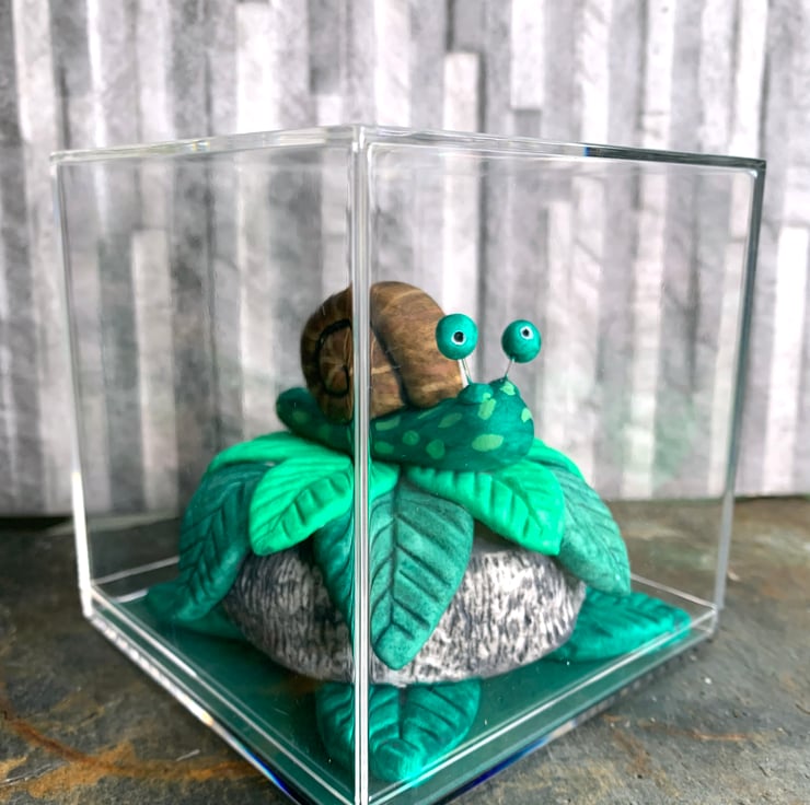 Polymer Clay hand crafted and painted snail in an acrylic display box. The snail sits on a bed of leaves and rock al made from clay. A great gift for a garden lover or child who love critters.