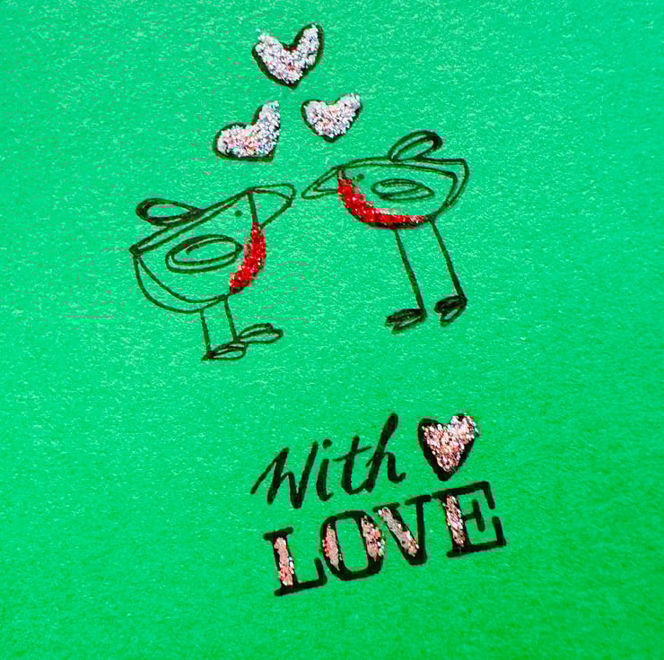 Behind the decoration, the brightly coloured thick card is hand decorated with 2 glittery robins and hearts and the greeting “with love”