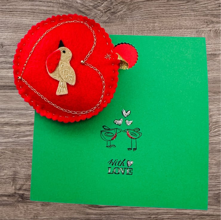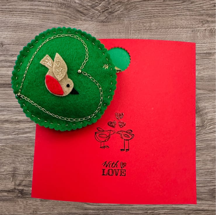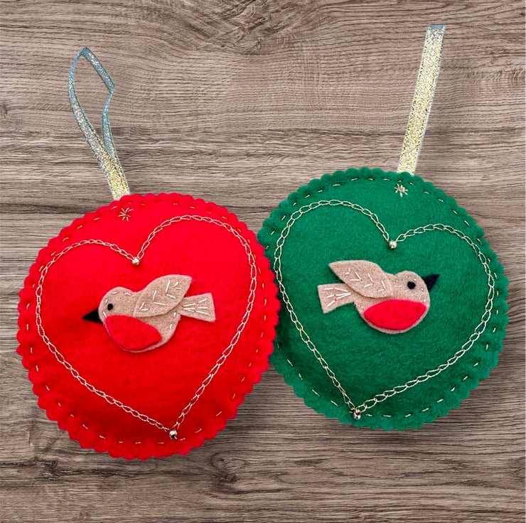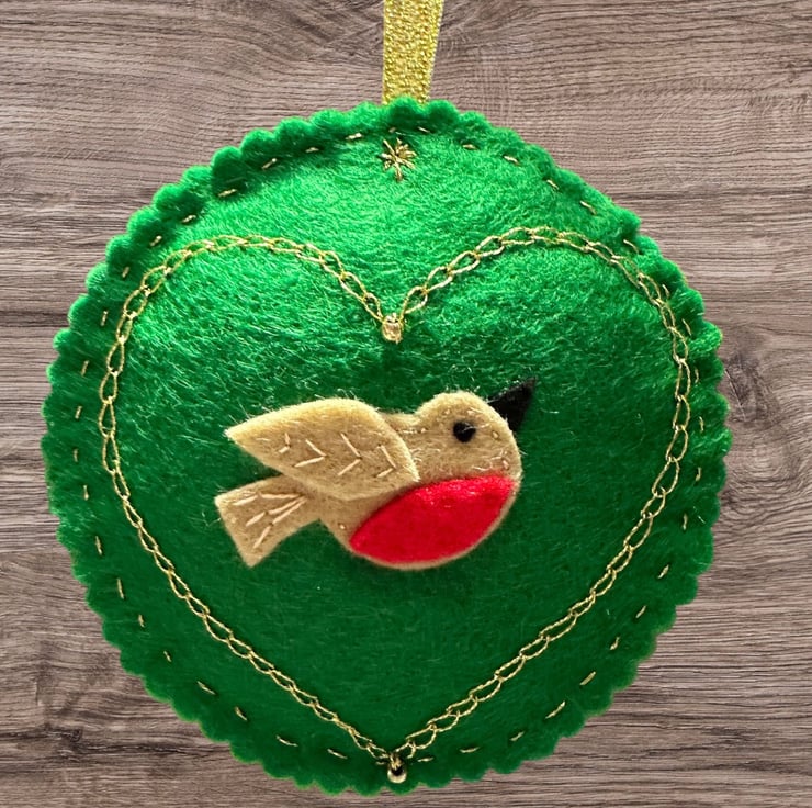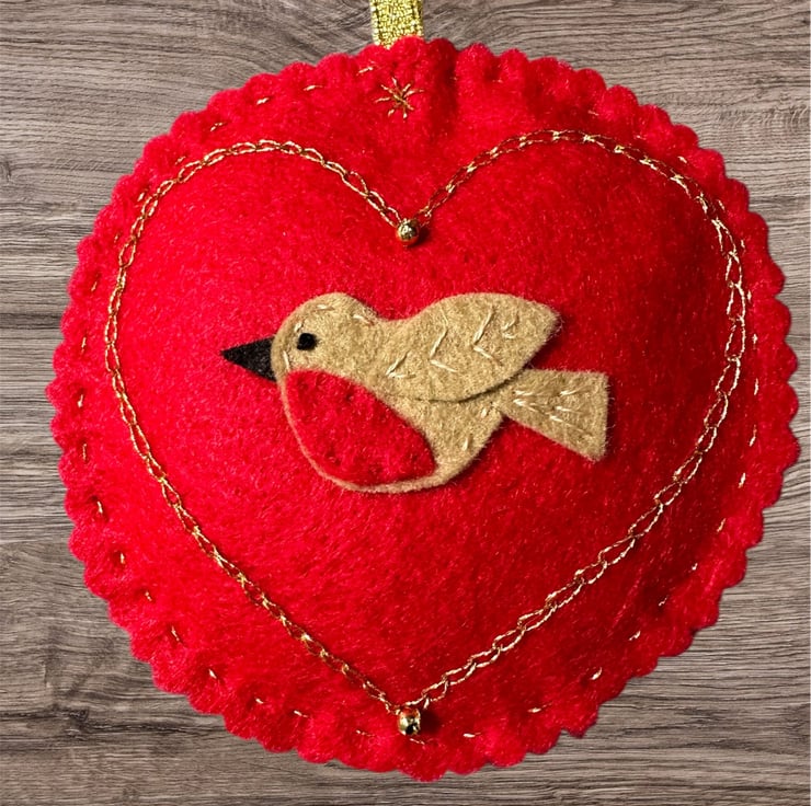 A hand cut felt Christmas decoration with a hand embroidered heart in metallic gold thread and 2 gold beads. Within the heart sits a cute hand crafted robin with coordinating gold ribbon for hanging.