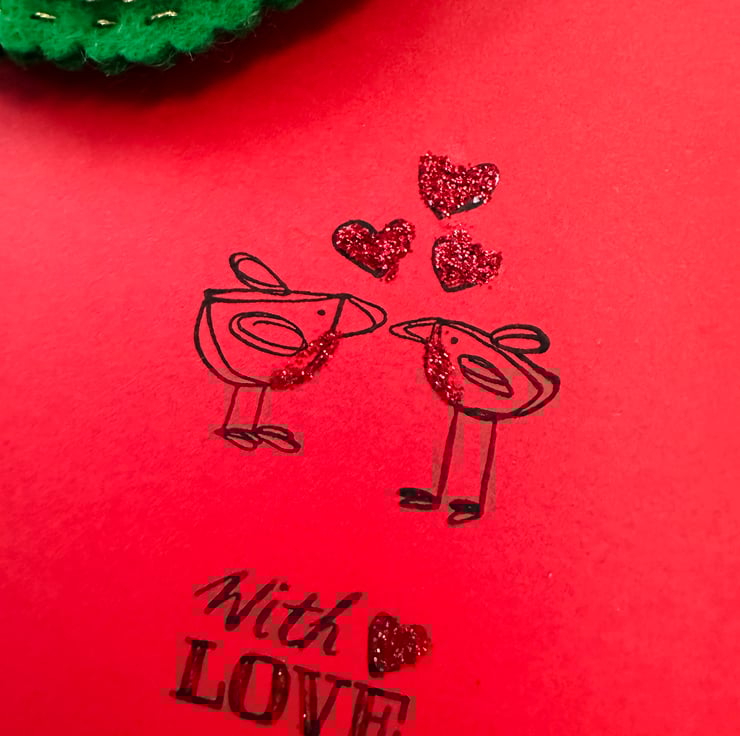 Behind the decoration, the brightly coloured thick card is hand decorated with 2 glittery robins and hearts and the greeting “with love”