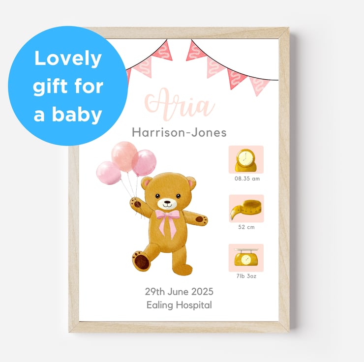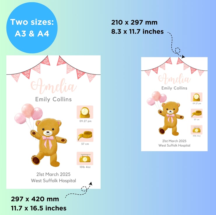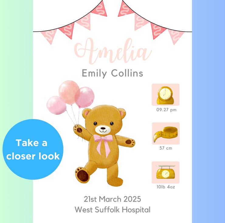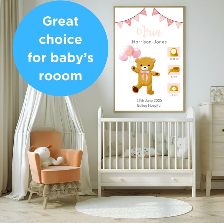 Every little one loves their teddy! I felt inspired to create the artwork of the dancing teddy holding balloons to celebrate the birth of your little one and to bring her joy.