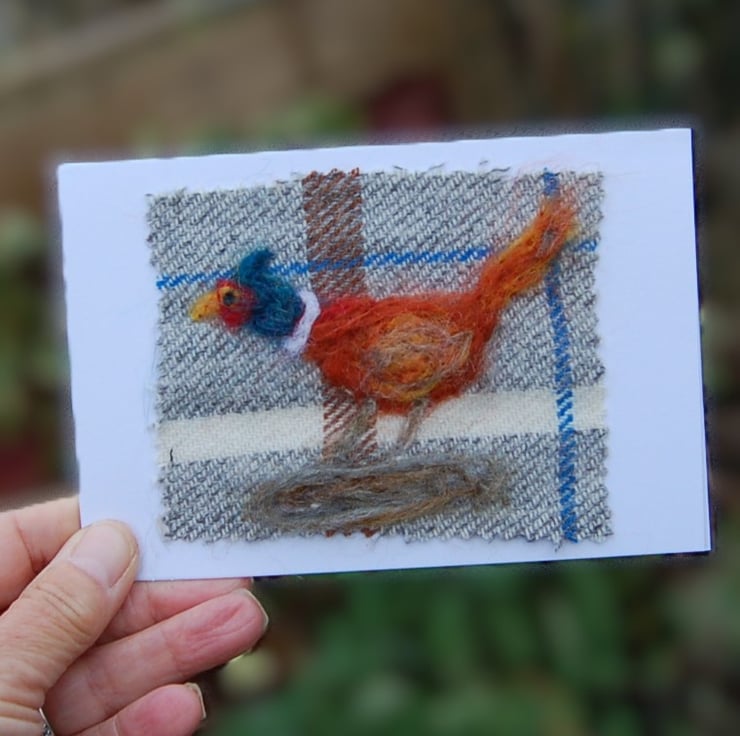 The pheasant has made by needlefelting unspun fibre onto a piece of pure wool fabric.