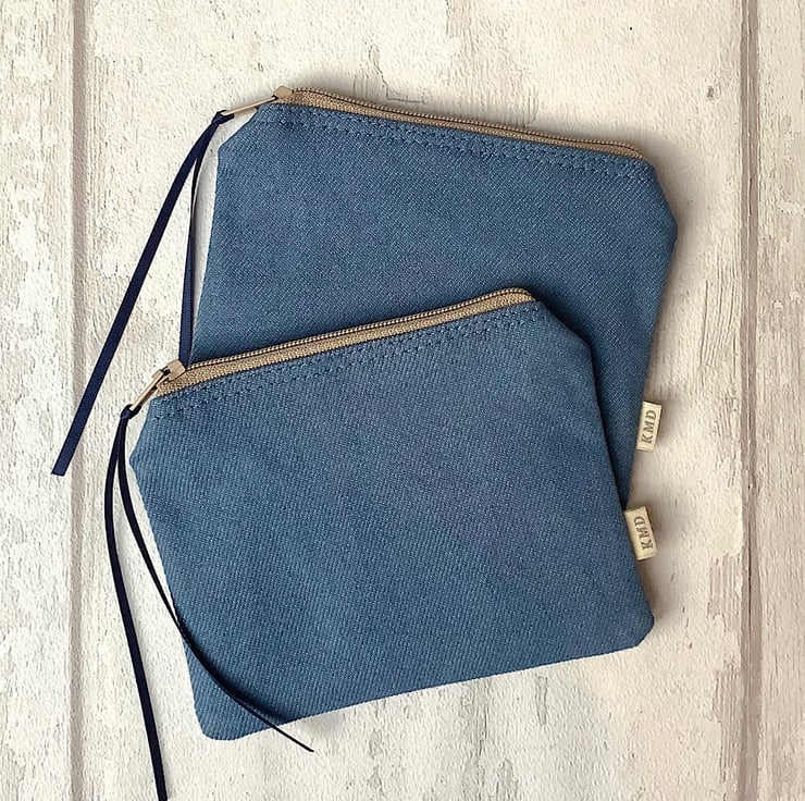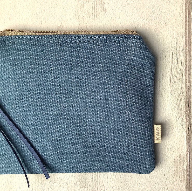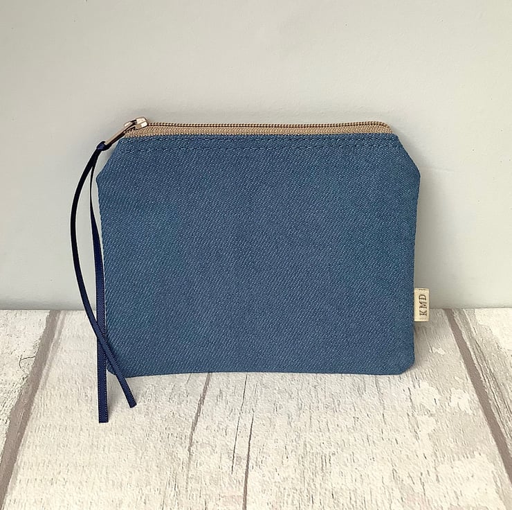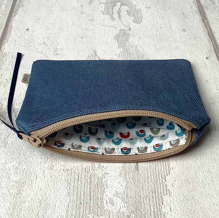 Mid blue denim style coin purse with geometric cotton lining and a beige zip. 12.5cm wide by 9.5cm high. Matching tote bag available with this item.