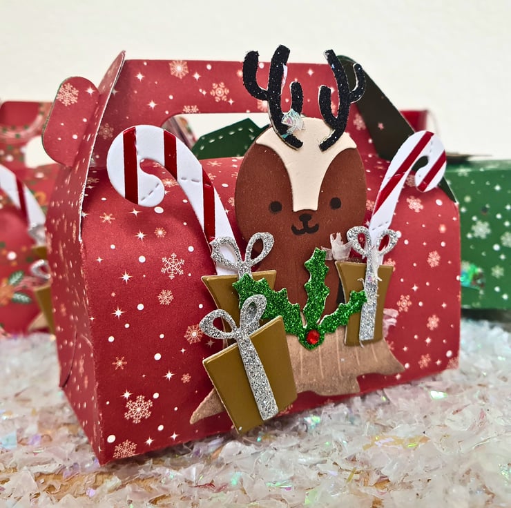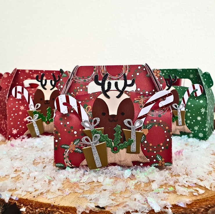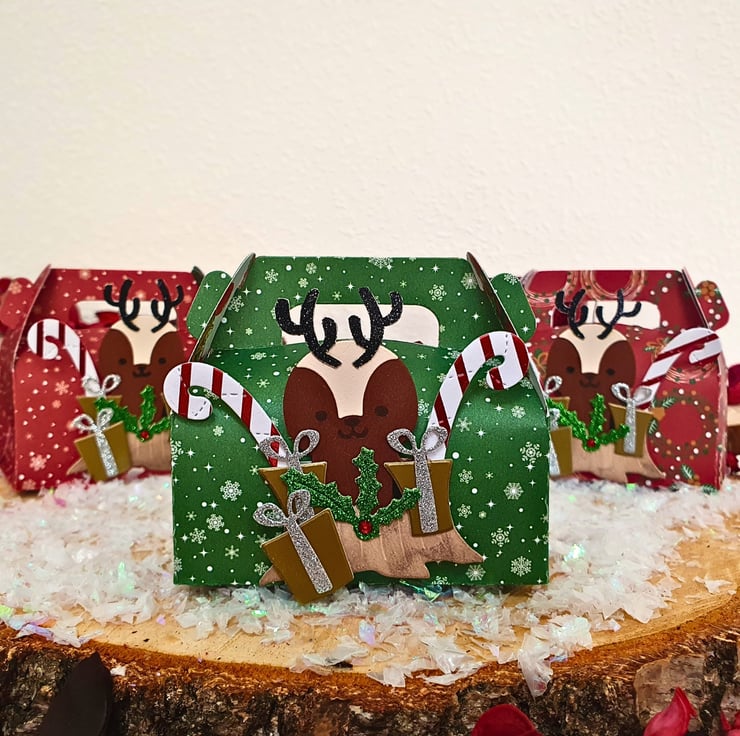 They come in a pack of 5 and the boxes will be ready made (not flat packed). Each box comes with 1 reindeer embellishment & 1 tag, which will have a foam pad attached on the back, so you can write & place them on the box according to your liking. You will receive a mix of Christmas patterned designs.