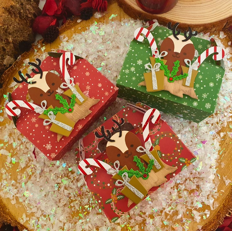 The gift boxes are made with double sided, Christmas themed patterned card. All the elements of the reindeer embellishment & the tag are die-cut from quality glitter/coloured card and they are inked & stamped by hand.