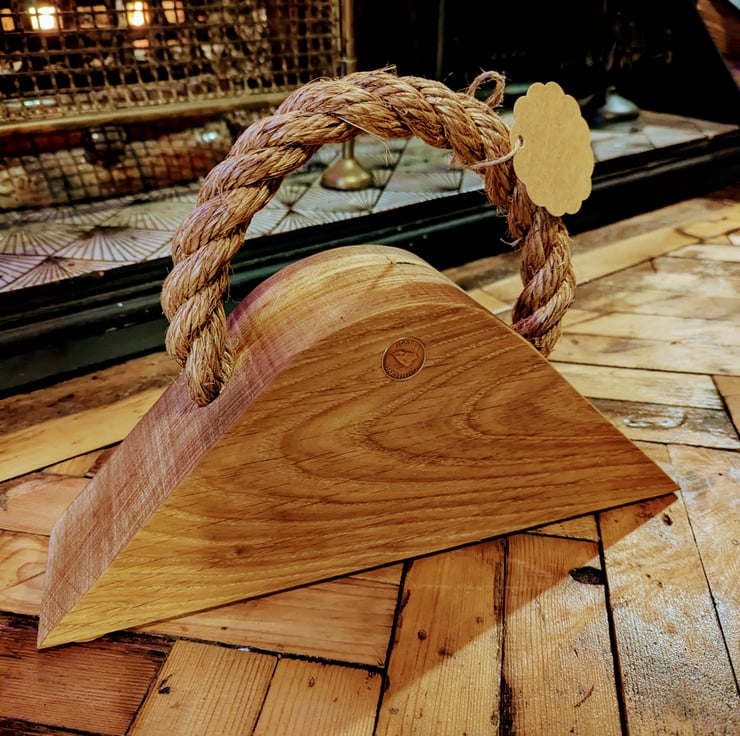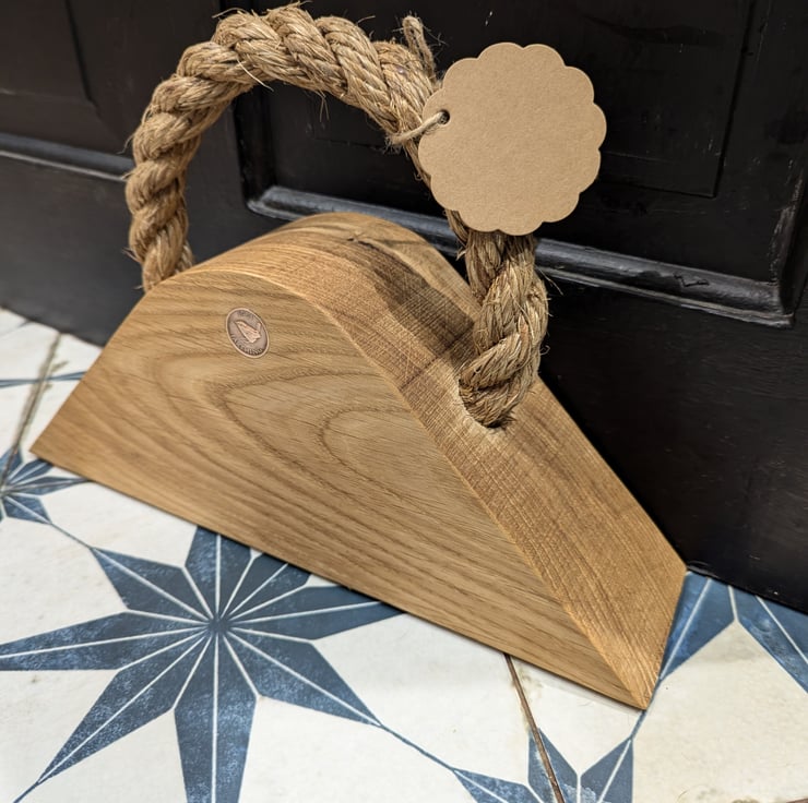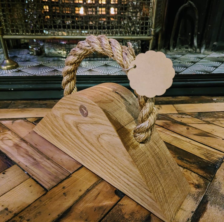 solid oak and rope doorstop, each doorstop comes with its own original farthing coin inset.