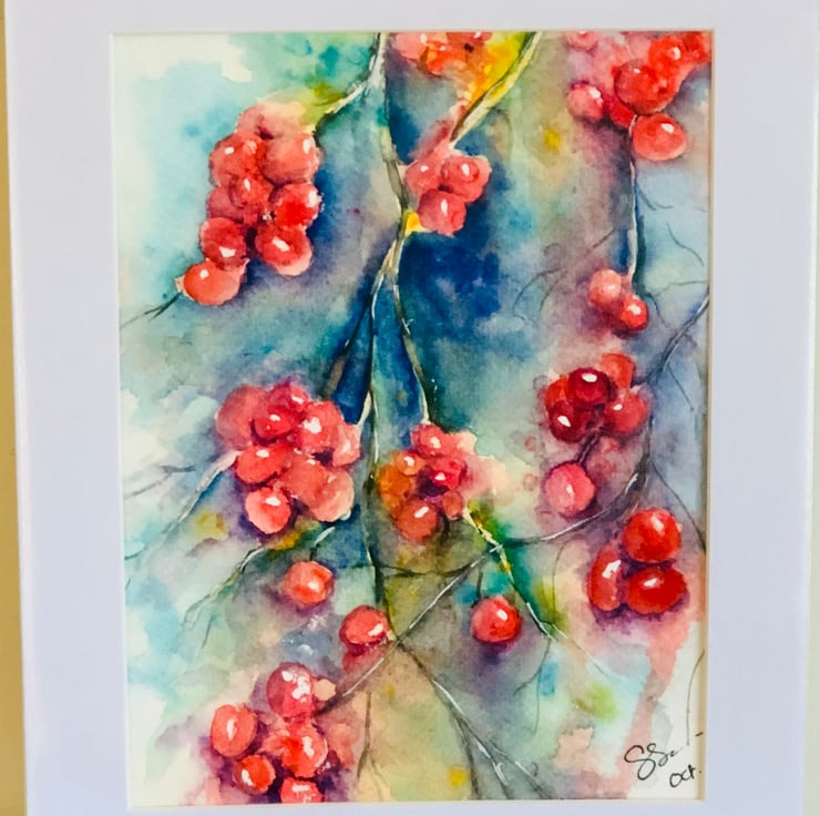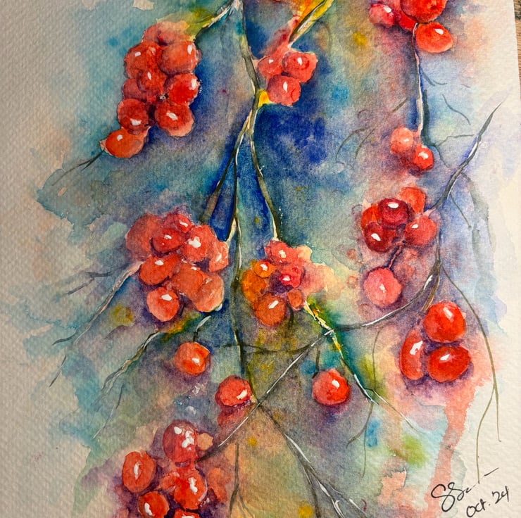 In winter the hedgerows are adorned with bright berries and hips providing bursts of colour against the bare branches. Painting in this way (negative painting) is responsive to the paint and each will be unique every time that you make one. It’s the journey, the paper, the paint and a sprinkle of magic.