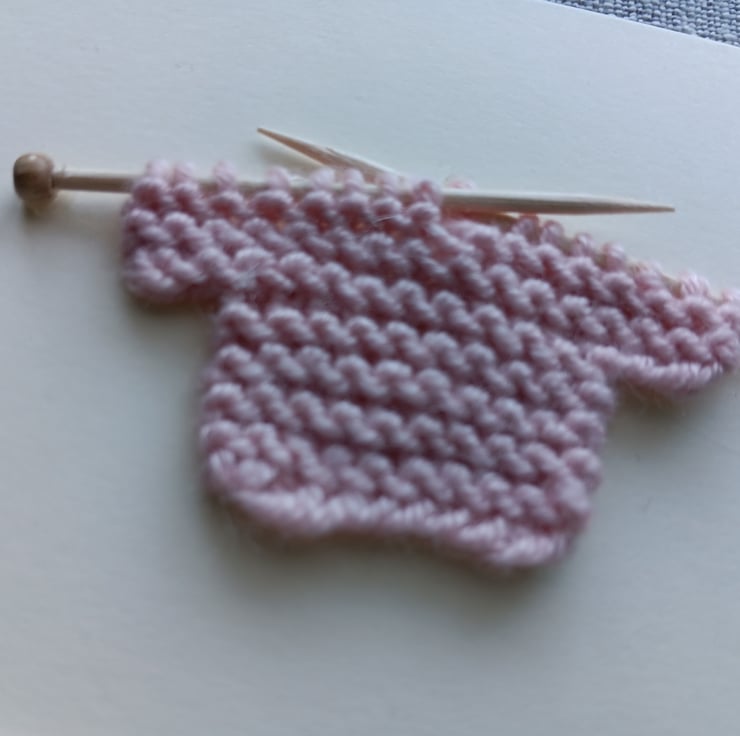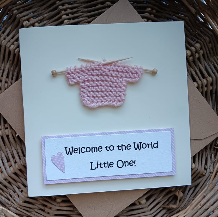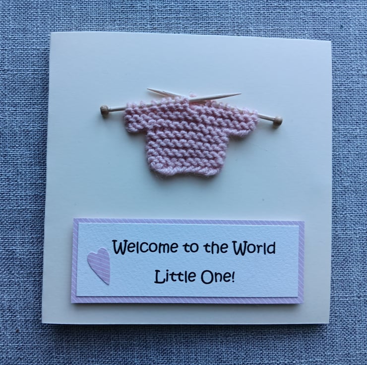 The little knitted jumper is hand knitted by myself with pale pink baby wool and transferred onto my handmade little knitting needles. It is then stuck onto a cream card. The words are slightly raised. There might be small variations in the colours and positioning as each card is unique and handmade.