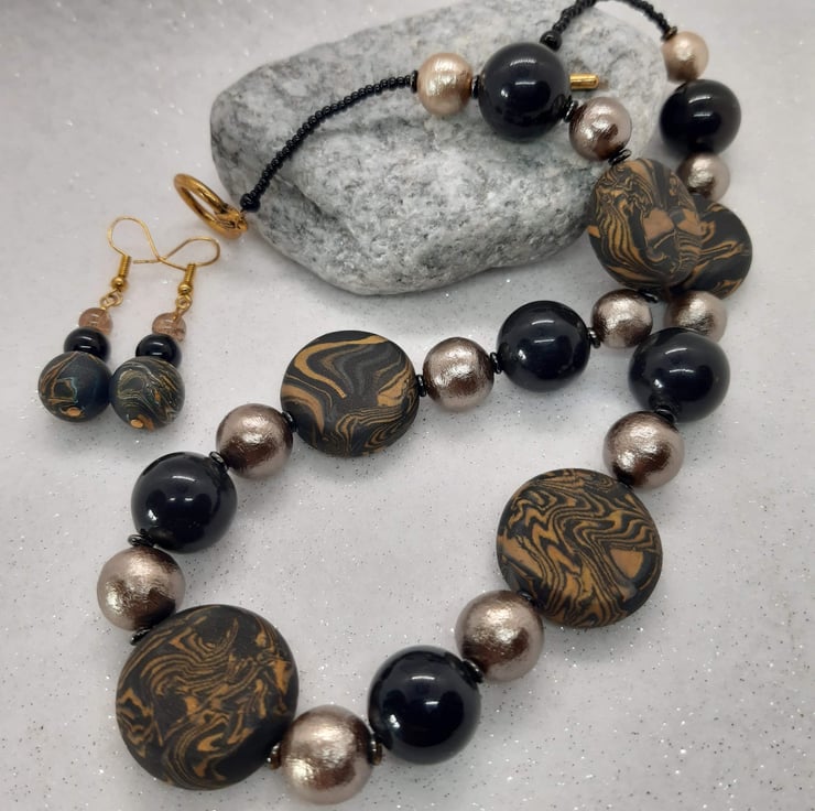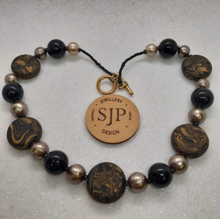 Disc shaped beads featuring gold and black polymer clay in a unique swirl design.