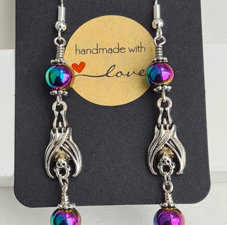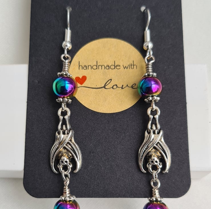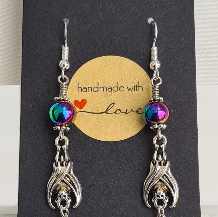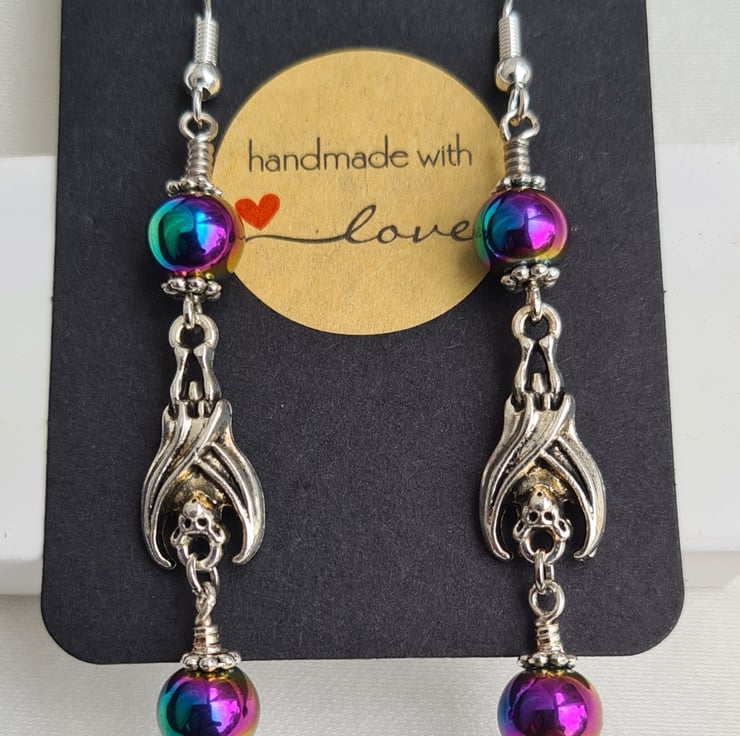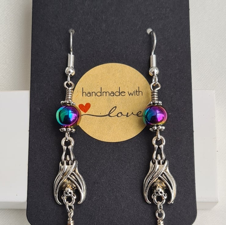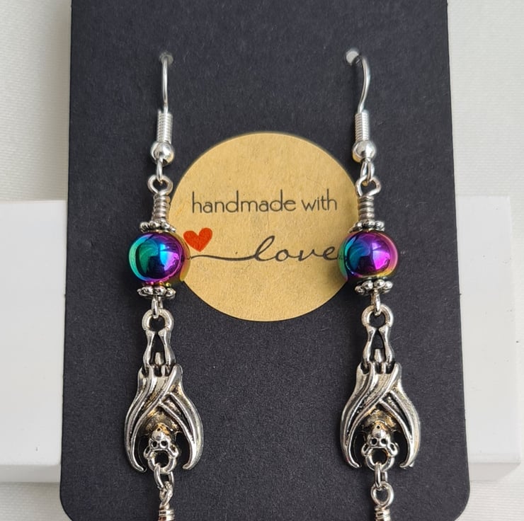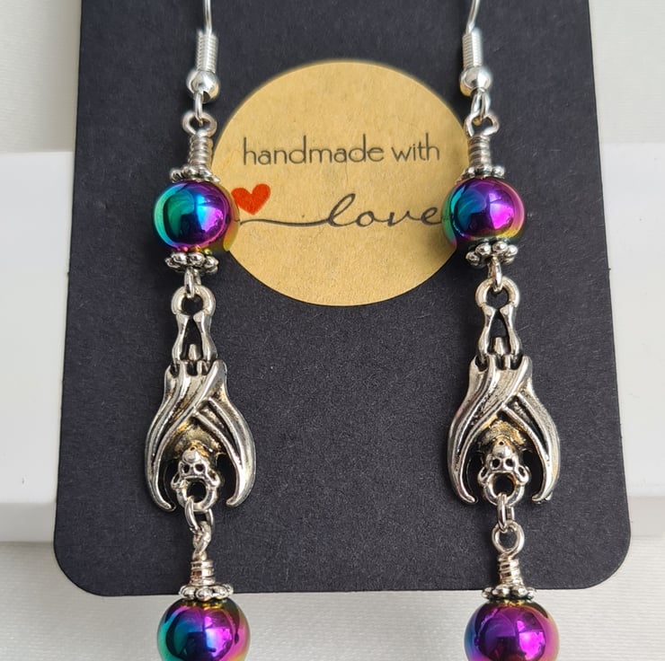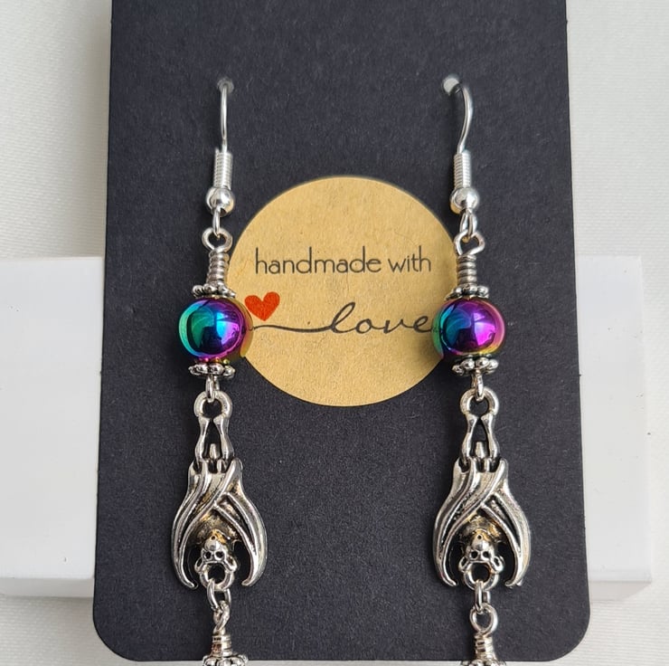 Gorgeous dangly Bat Earrings with fabulous colourful Haematite beads. A lovely Gothic pair ideal for Spooky Season or for everyday wear.