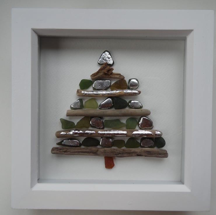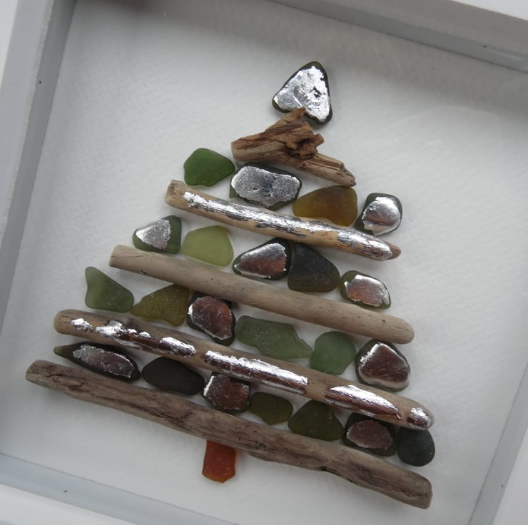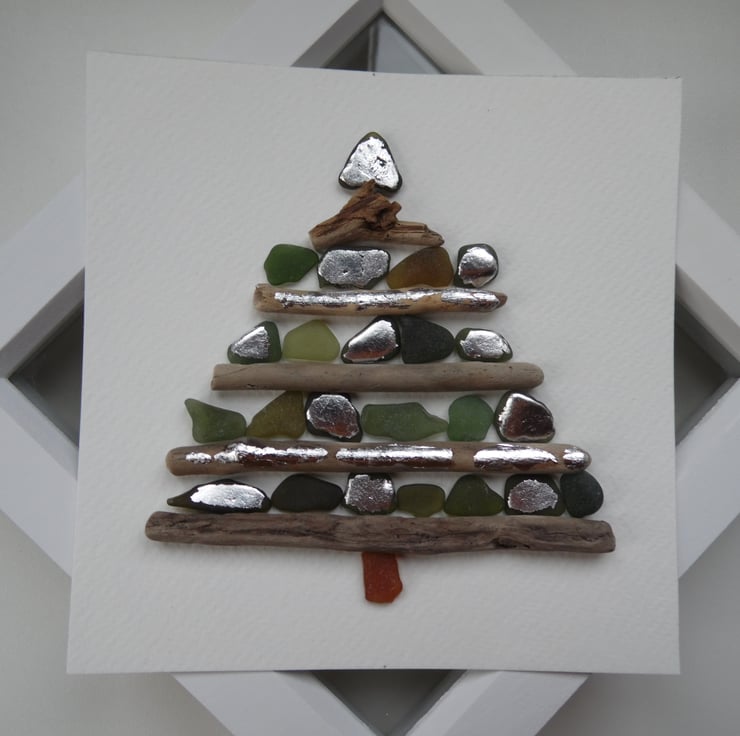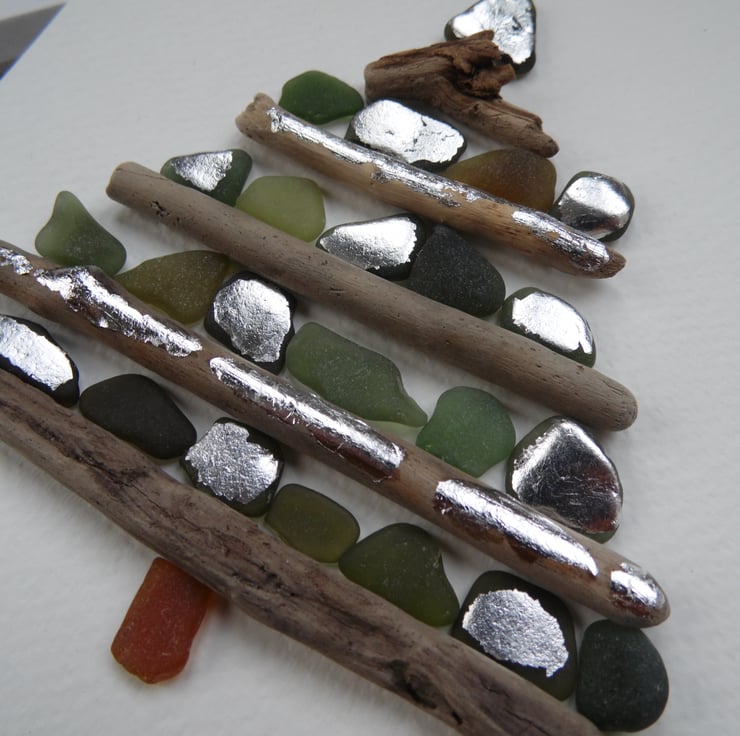 A beautiful Christmas tree made with driftwood and shades of green sea glass adorned with silver foil.
