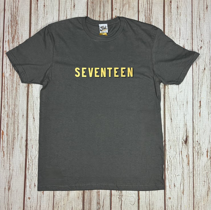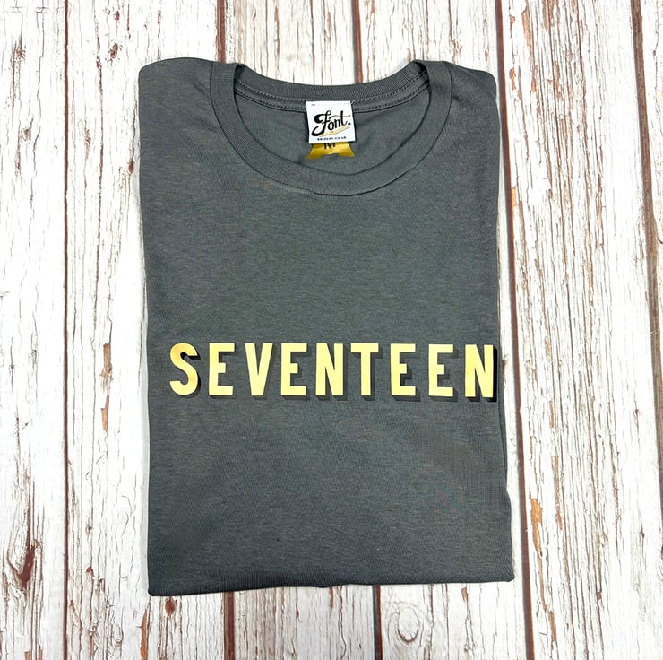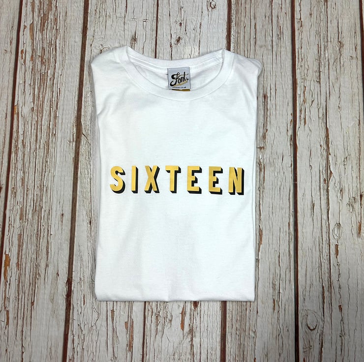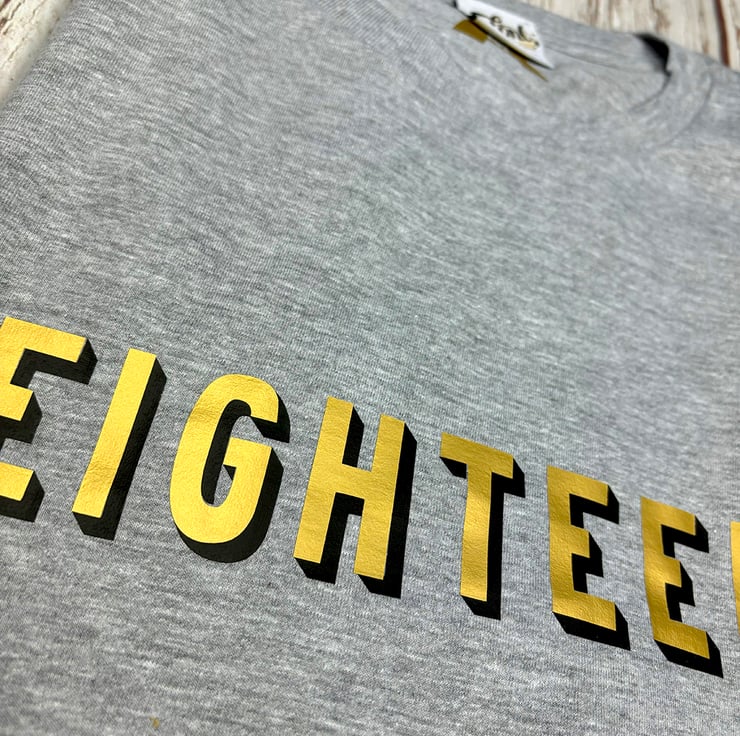 We have some big numbers Sixteen, Seventeen and Eighteen in our own Bingley Bang typeface! We've used a high-quality cotton T-shirt available in three colours - White, Heather (light) Grey or Asphalt (mid) Grey. Our 'Bingley Bang' font is available in every number (just ask if you don't see the number you require). We make your number up of shiny gold and black shadow!