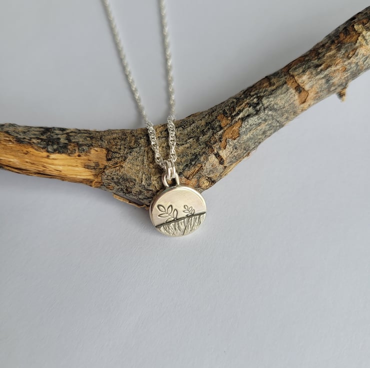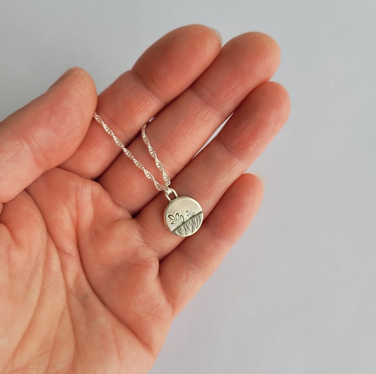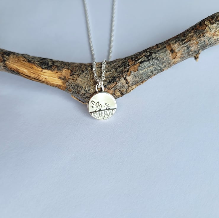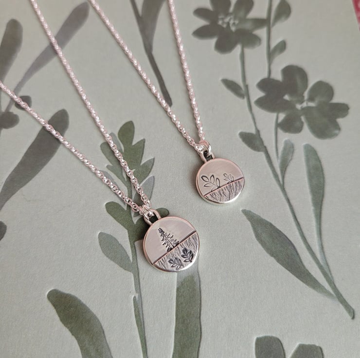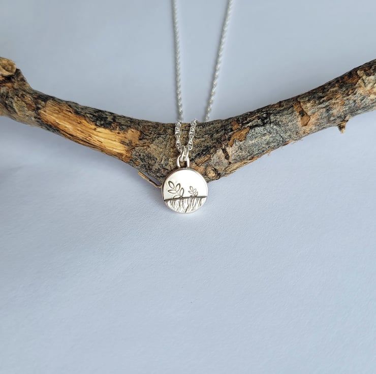 Handmade in recycled sterling silver, this charming little pendant necklace features a stamped leaf details and a raised section that has been hammered with the edge of a hammer to create a meadow field.