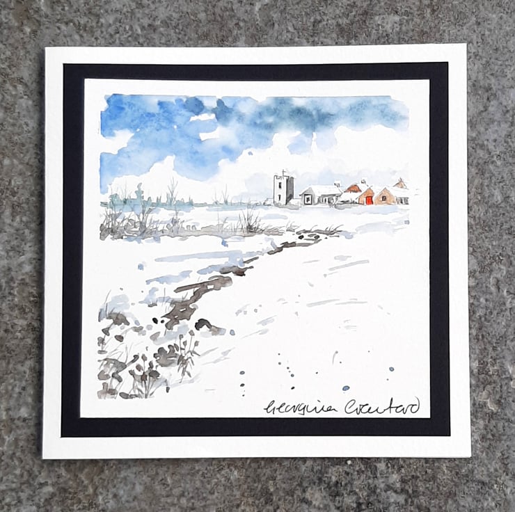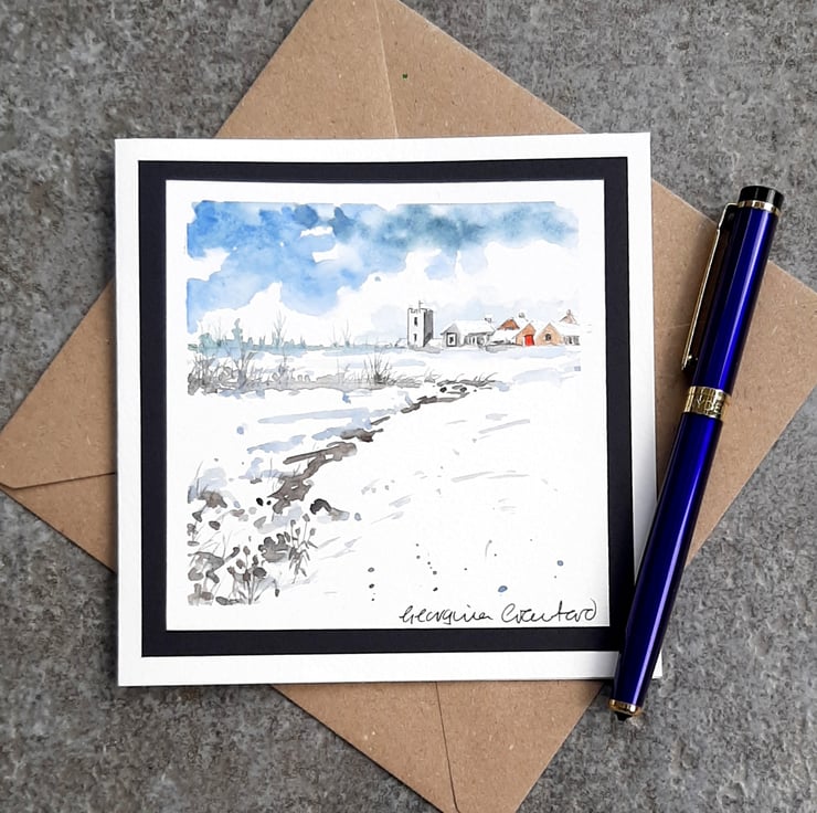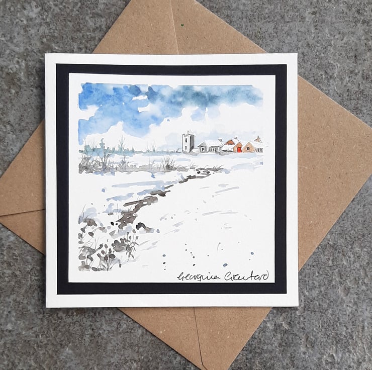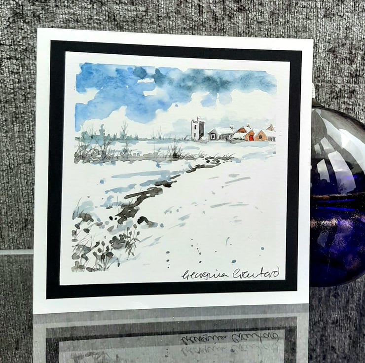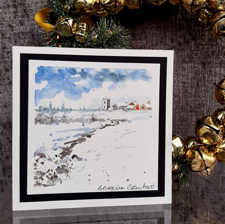 Beautiful handpainted mixed media Christmas card of snowy landscape.