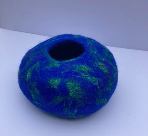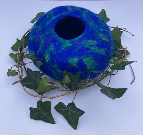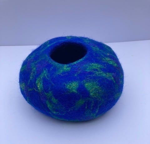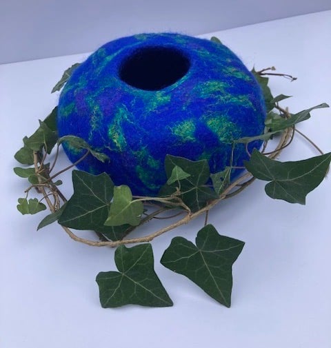 This organically shaped textile bowl has been created with wool using the wet felting process. The rich blue merino wool background has then been embellished with emerald green sari silk to create a beautiful pattern.