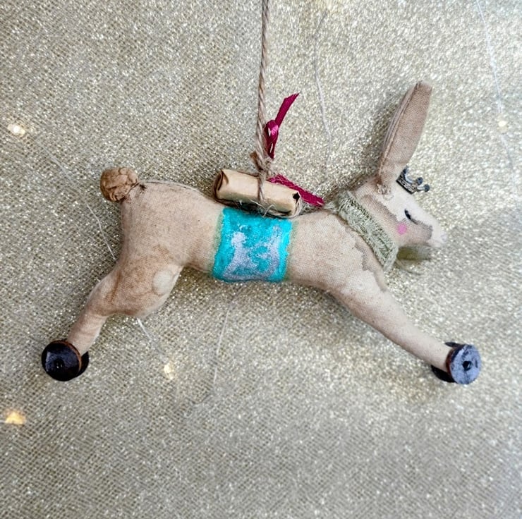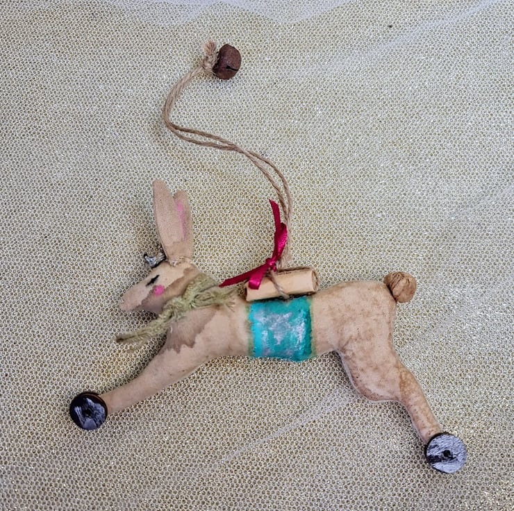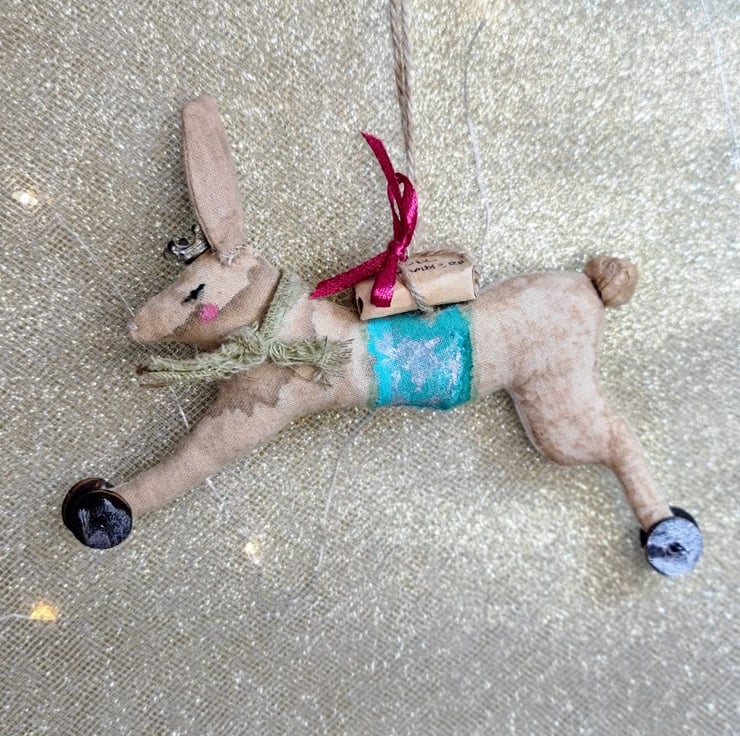 This precious little hare is made in unbleached cotton. Hand stainded and painted for an aged vintage feel. On its back is a little parcel wrapped in string and red sating ribbon (for her good friend mole actually). A wee aged crown sits upon her head, and each leg has a little wooden wheels, my nod and a wink to victorian pull me toys. Jute string is topped with a rusty bell is used for hanging.