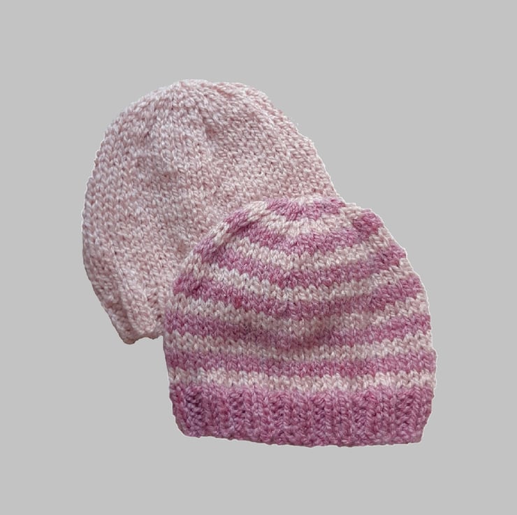 This hand knit PATTERN is for a hat for baby. To fit size: newborn (3 months: 6-9 months: 12 months). Circumference: 35 (37: 40: 43) cm, 14 (15: 16: 17) inches. Hats are knitted in chunky yarn using 6 mm and 6.5 mm knitting needles. They are knit flat on a pair of single pointed needles or knit in the round on a set of double pointed needles.
