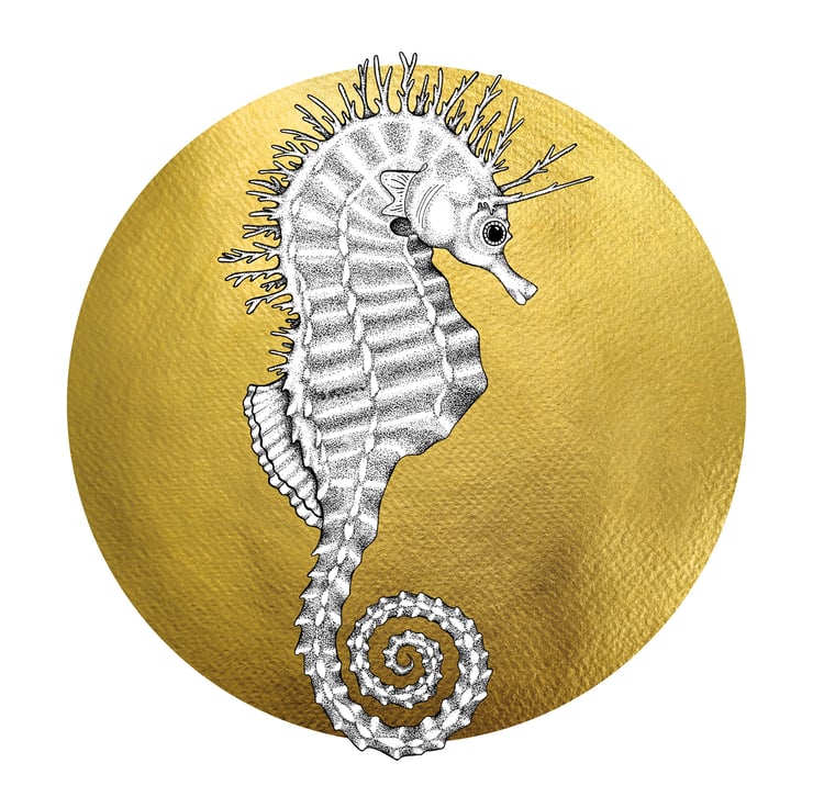 Beautiful greetings card of Steph the Spiny Seahorse in black and white on a gold circular background to give to all those lovers of the sea, sea life, coast and vibrant colours.