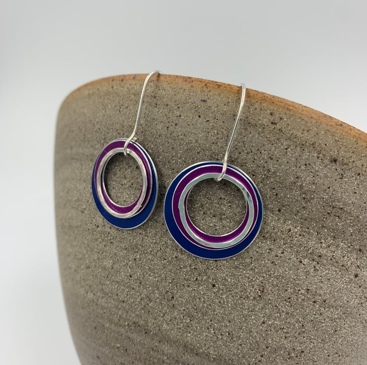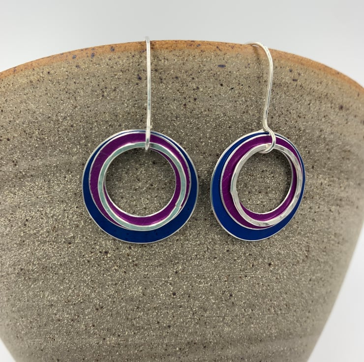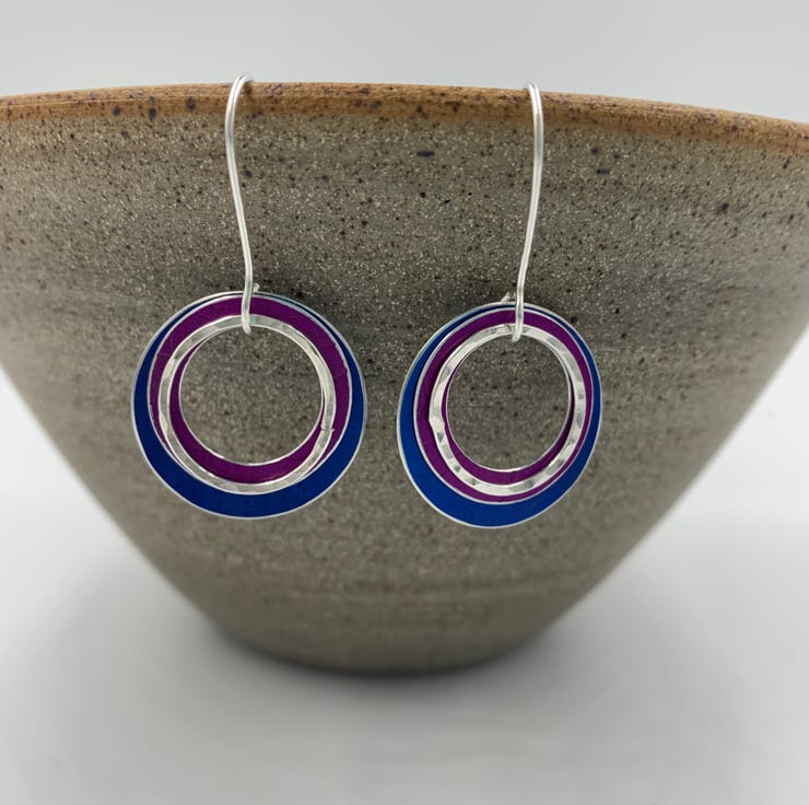 These lightweight colourful earrings are made from hand dyed and textured anodised aluminium discs. A hammered recycled sterling silver ring hangs at the front. The rings swing and move independently on handmade sterling silver ear hooks. They were inspired by watching raindrops fall into a Norwegian fjord.