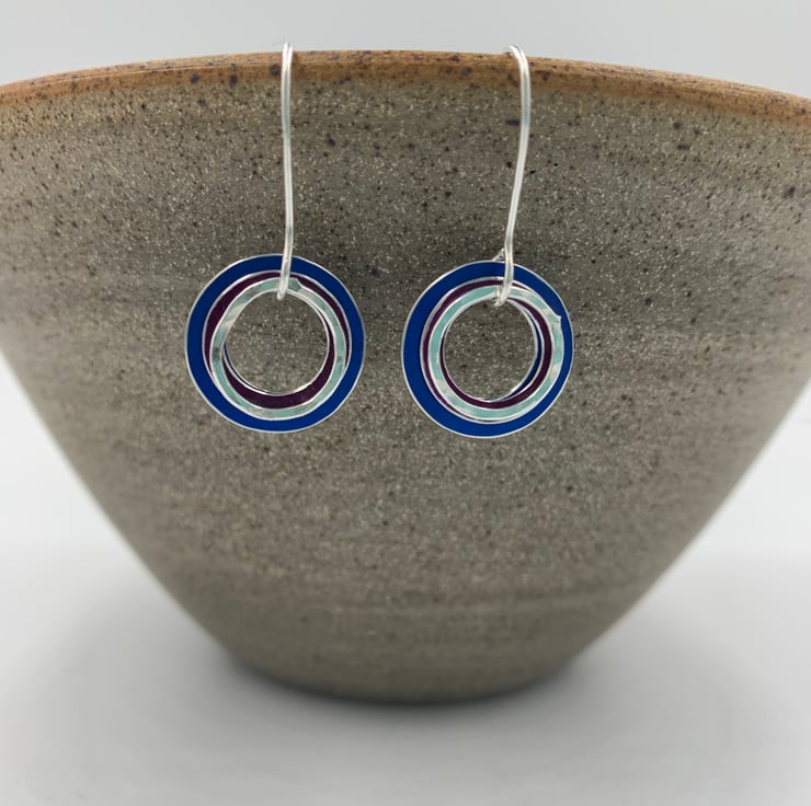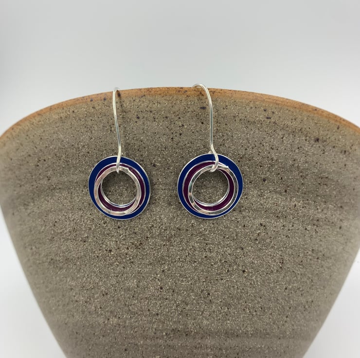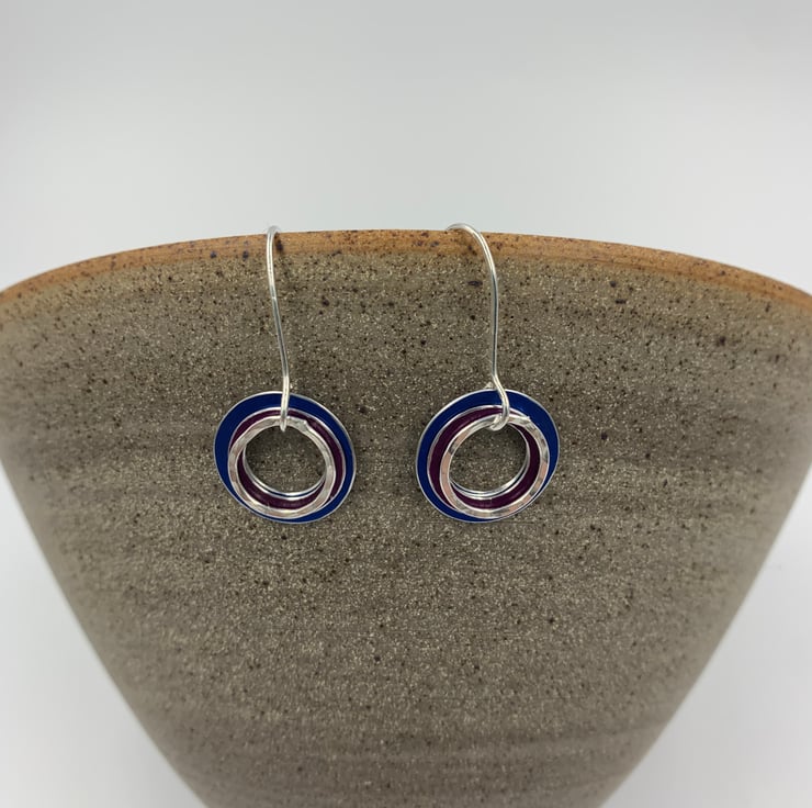 These lightweight colourful earrings are made from hand dyed and textured anodised aluminium discs in navy and dark pink.. A hammered recycled sterling silver ring hangs at the front. The rings swing and move independently on handmade sterling silver ear hooks. They were inspired by watching raindrops fall into a Norwegian fjord.