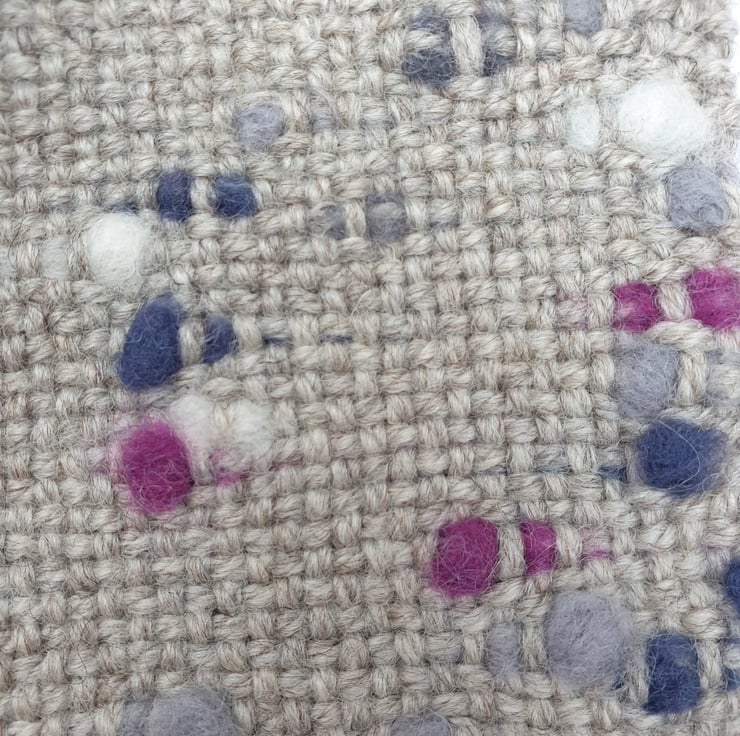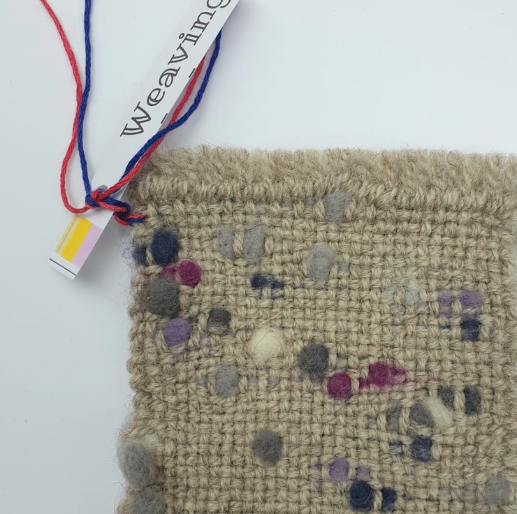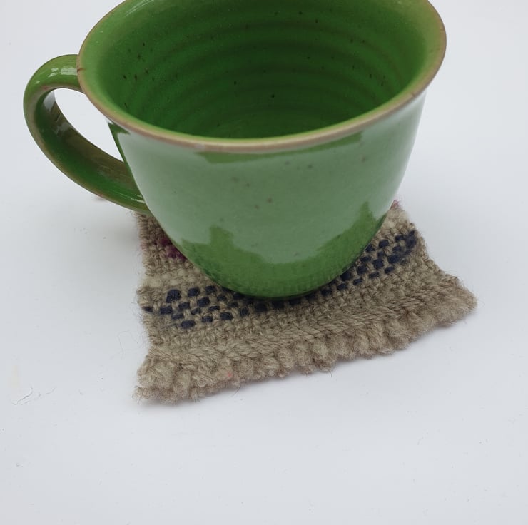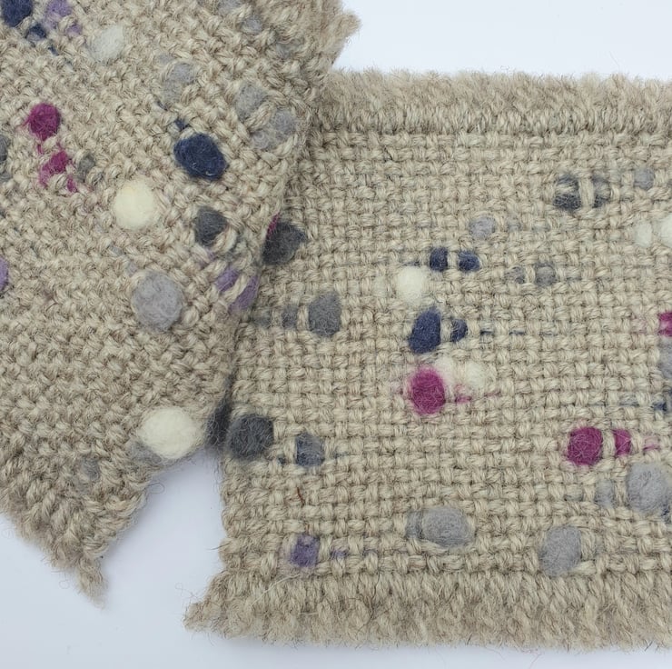 A pair of individually hand woven mug coasters. Woven with a warm grey tone Blue-faced Leicester wool featuring accent colour embellishment.