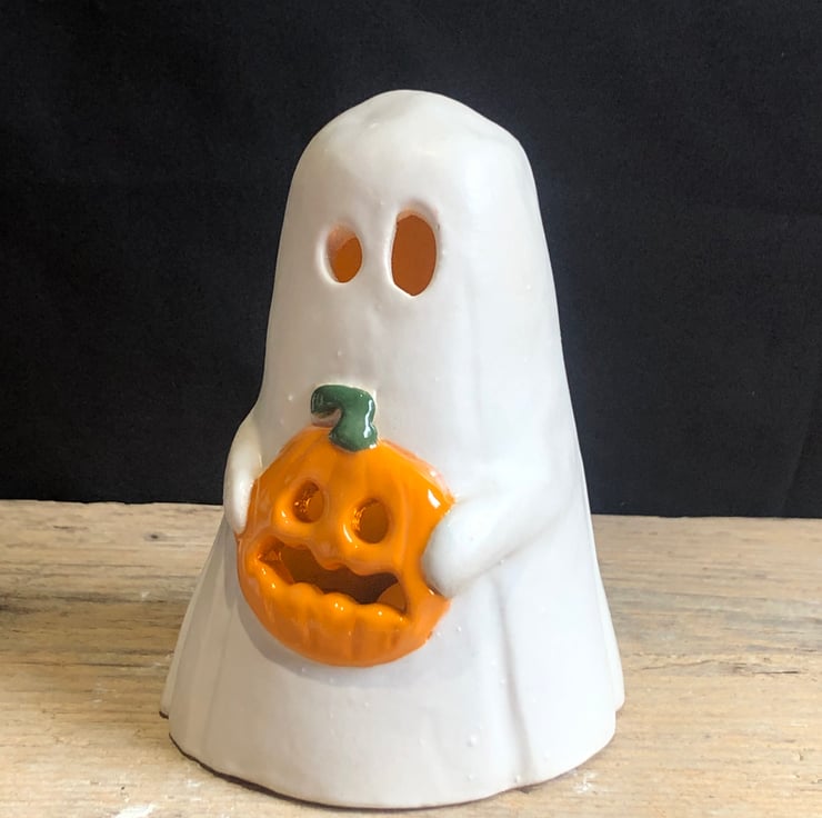 A handmade stoneware ghost holding a pumpkin tea-light holder - only one made of this design!