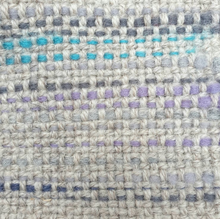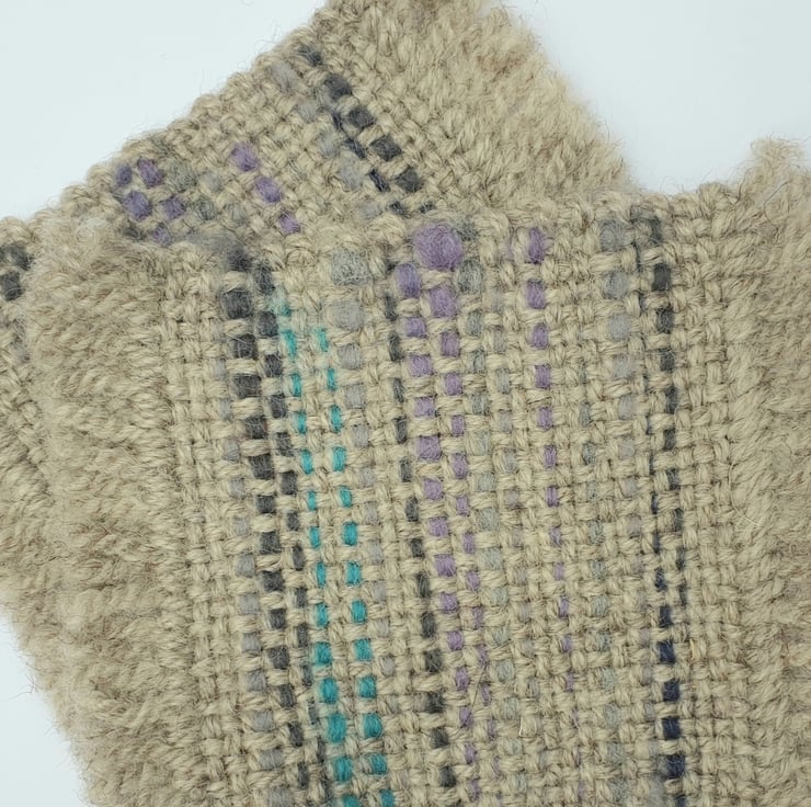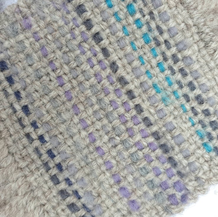A pair of individually hand woven mug coasters. Woven with a warm grey tone Blue-faced Leicester wool featuring accent colour embellishment.